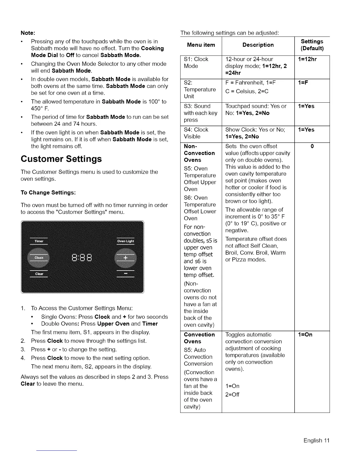 • In double oven models, Sabbath Mode is available for