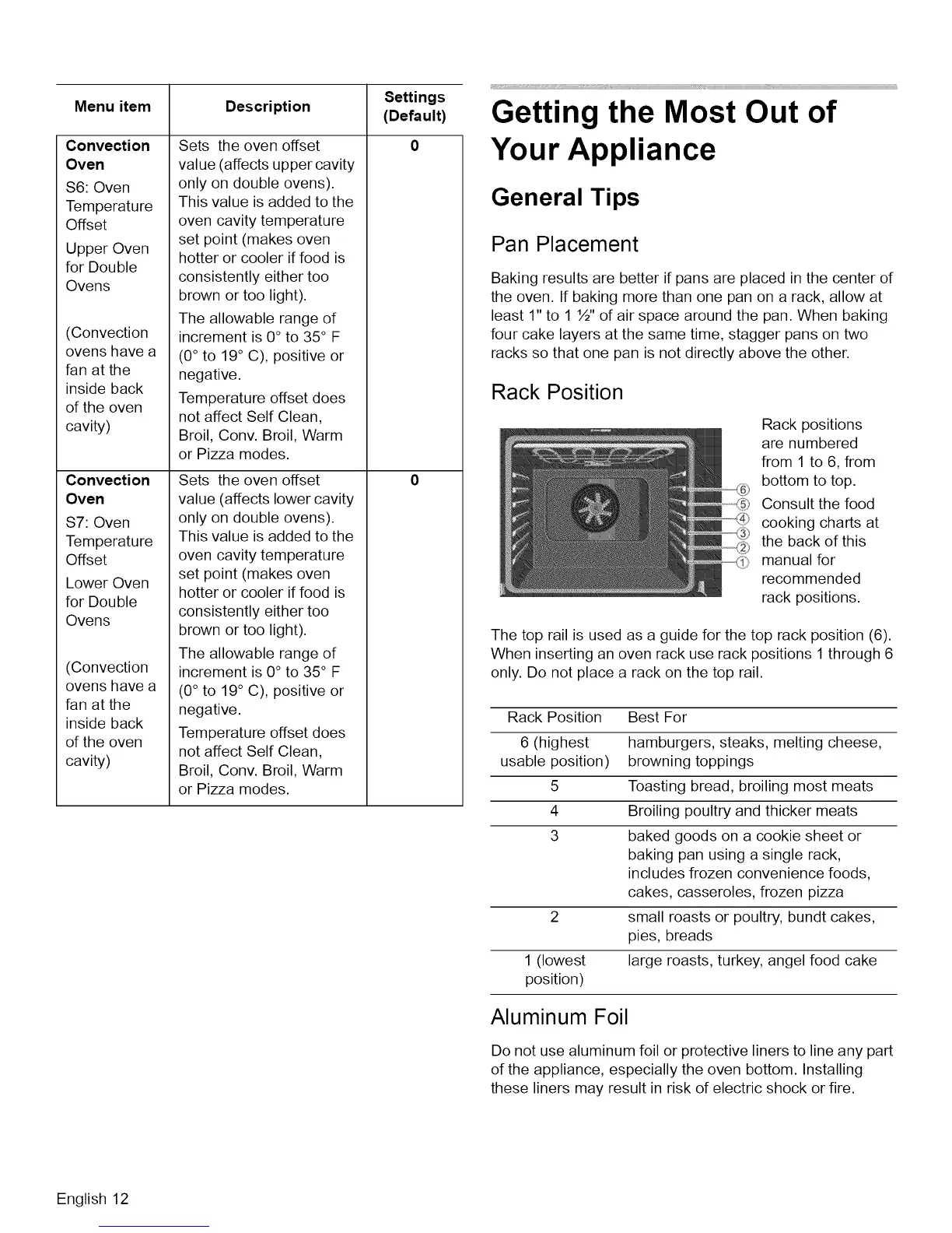 When inserting an oven rack use rack positions 1 through 6