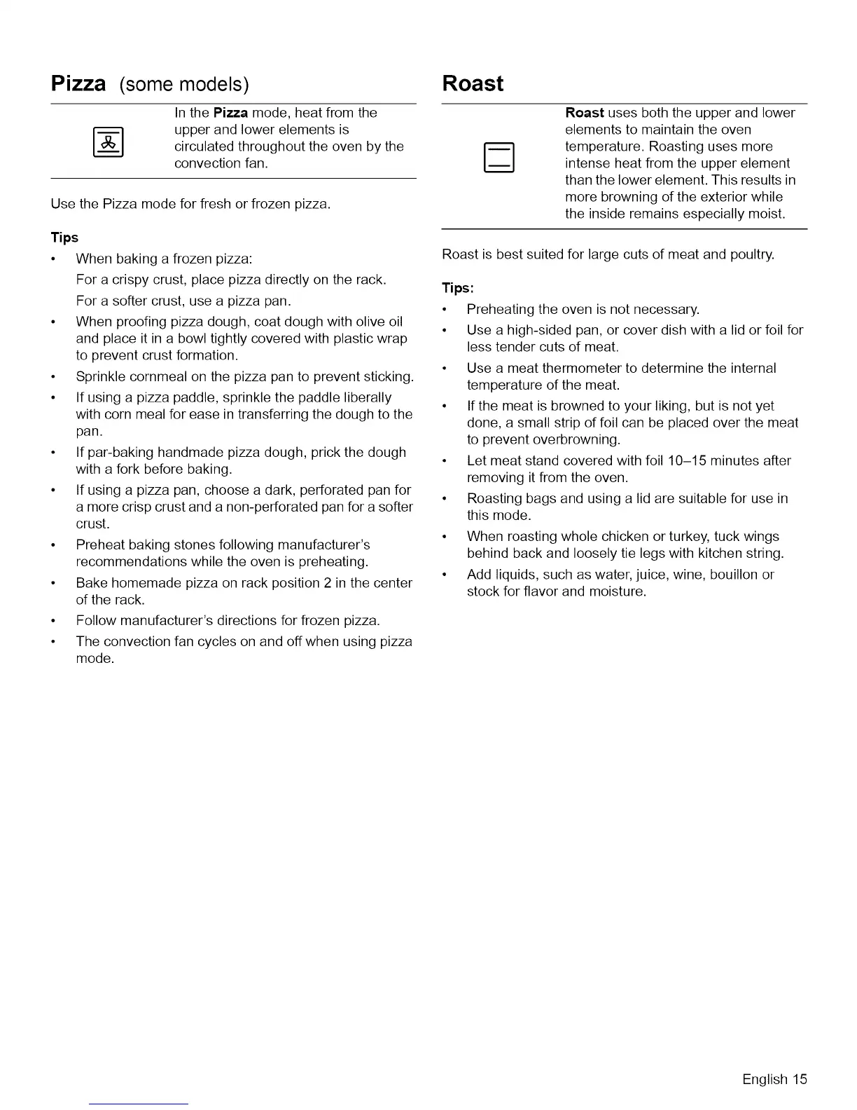 Pizza (some models) Roast