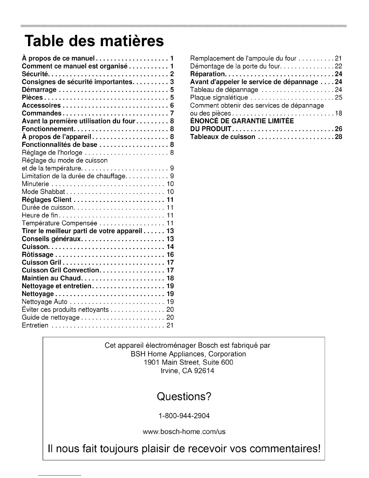Tableaux de cuisson ..................... 28