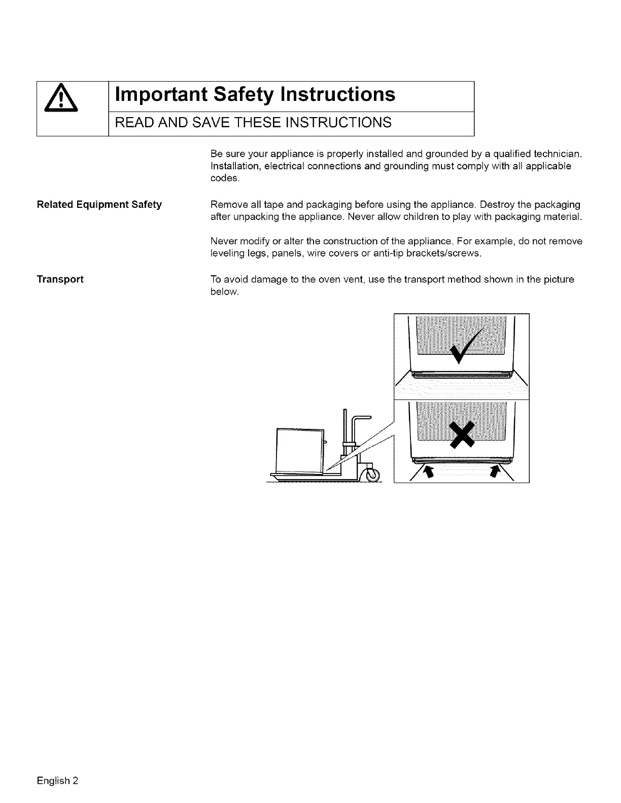 To avoid damage to the oven vent, use the transport method shown in the picture