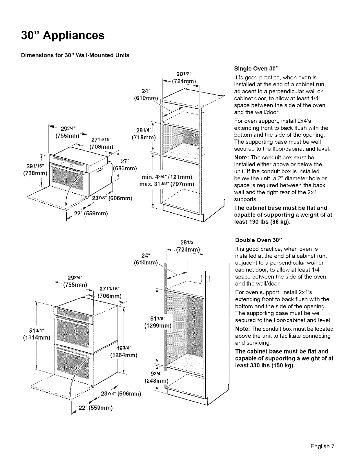 Dimensions for 30" Wall-Mounted Units