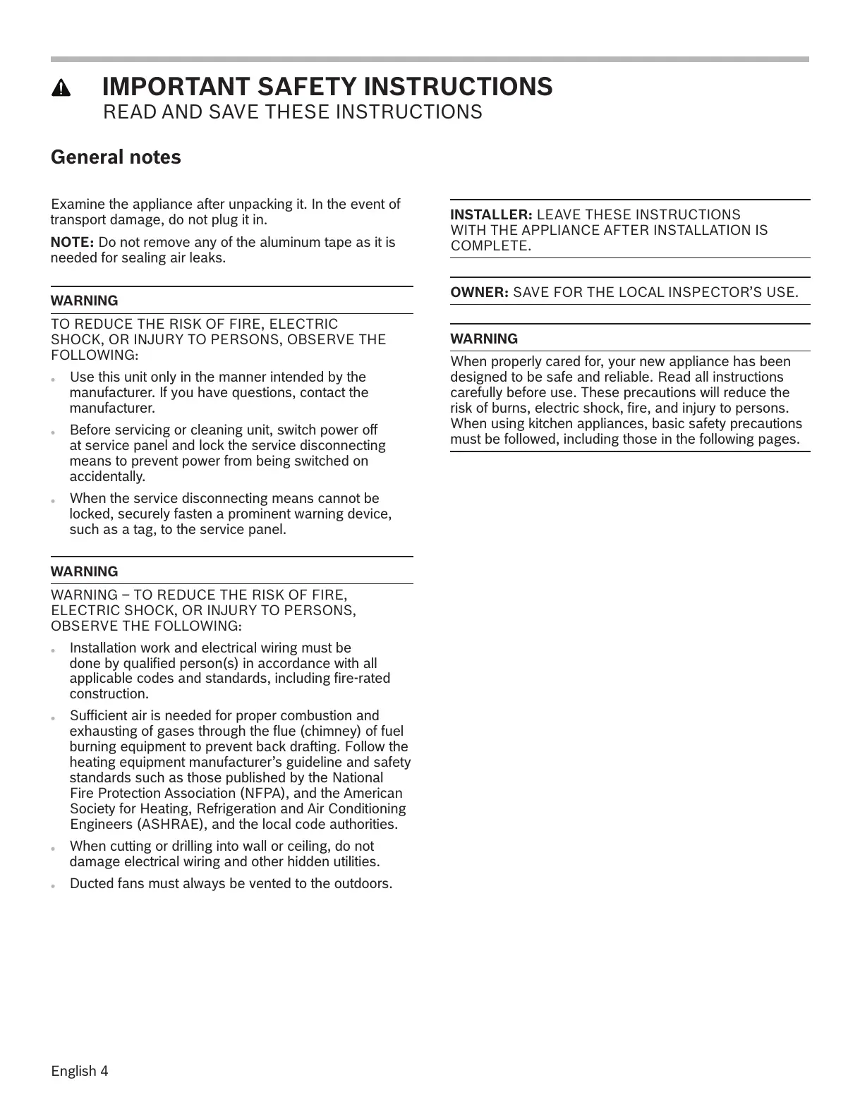 WARNING – TO REDUCE THE RISK OF FIRE,