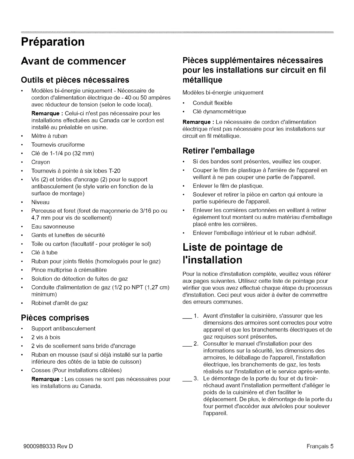 Bosch HDIPO54UC - Avant de Commencer; Liste de Pointage de Linstallation; Outils et Pieces Nécessaires; Piéces Comprises