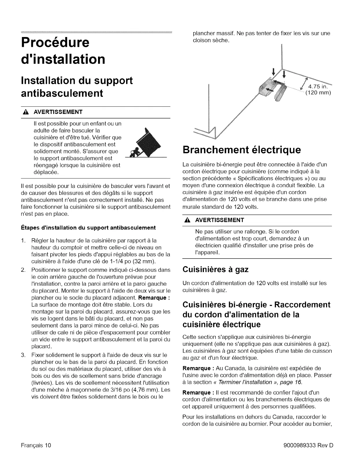 Bosch HDIPO54UC - Branchement Électrique; Cuisiniéres Bi-Énergie - Raccordement du; Installation du Support Antibasculement; Procedure Dinstallation