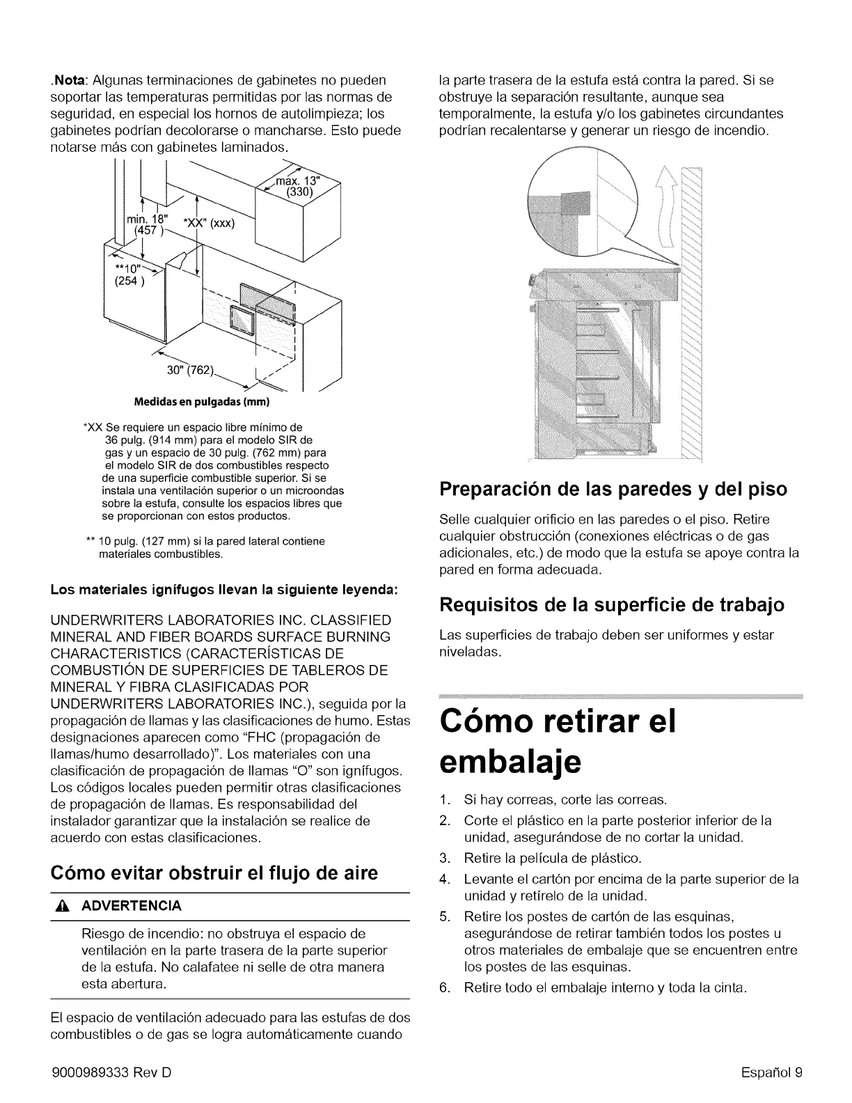 Bosch HDIPO54UC - Como Evitar Obstruir el Flujo de Aire; Como Retirar el Embalaje; Preparacion de las Paredes y del Piso; Requisitos de la Superficie de Trabajo