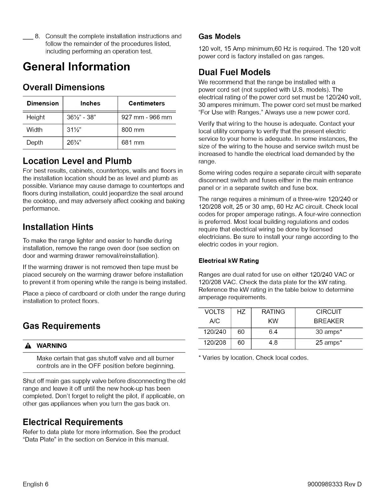 Bosch HDIPO54UC - Dual Fuel Models; Gas Models; Electrical Requirements; Installation Hints