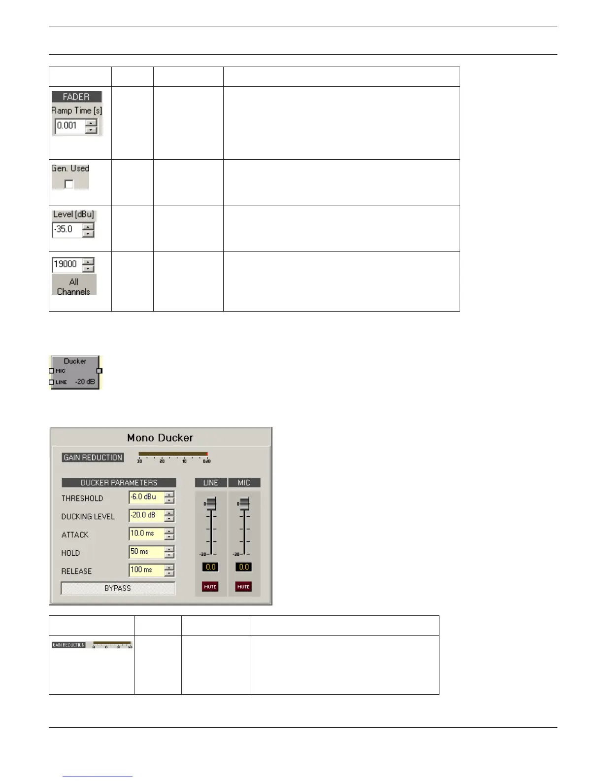 The Ducker DSP block reduces the level of a signal at the LINE input whenever a signal is present at the