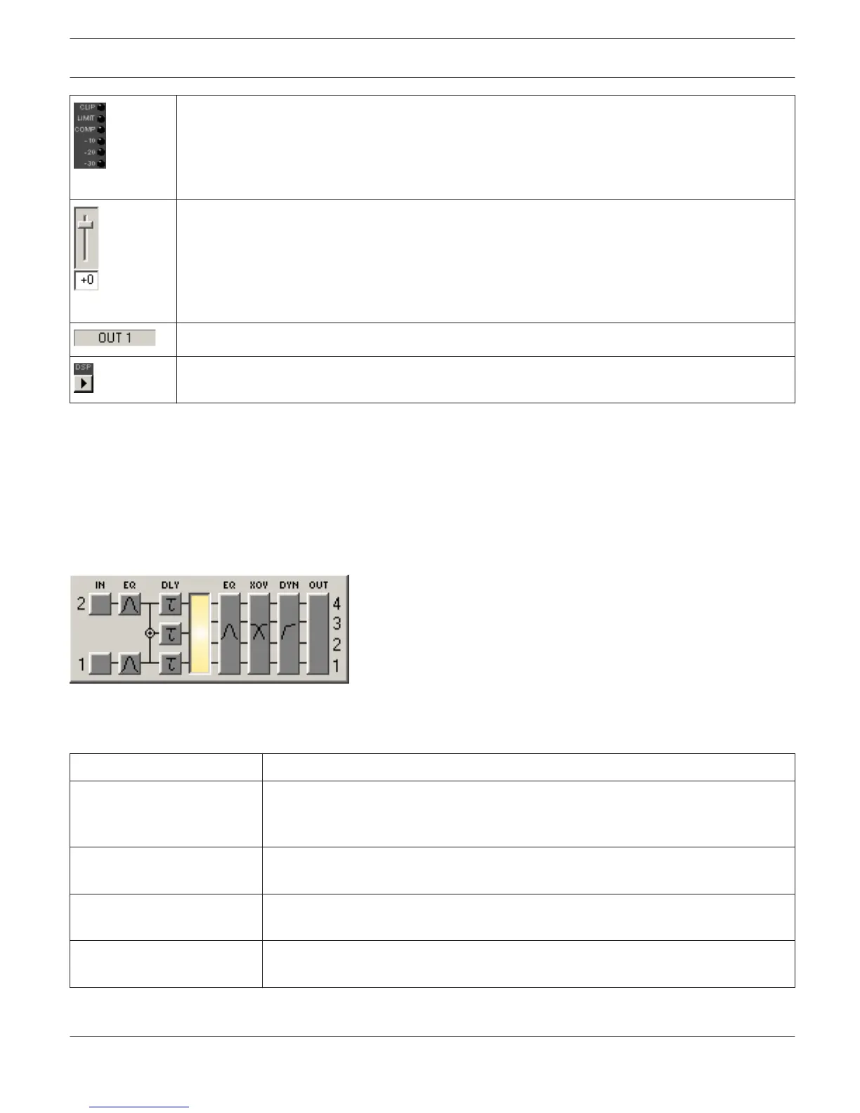 FLOW DIAGRAM The signal flow display provides an overview of an amplifier’s DSP settings. This area
