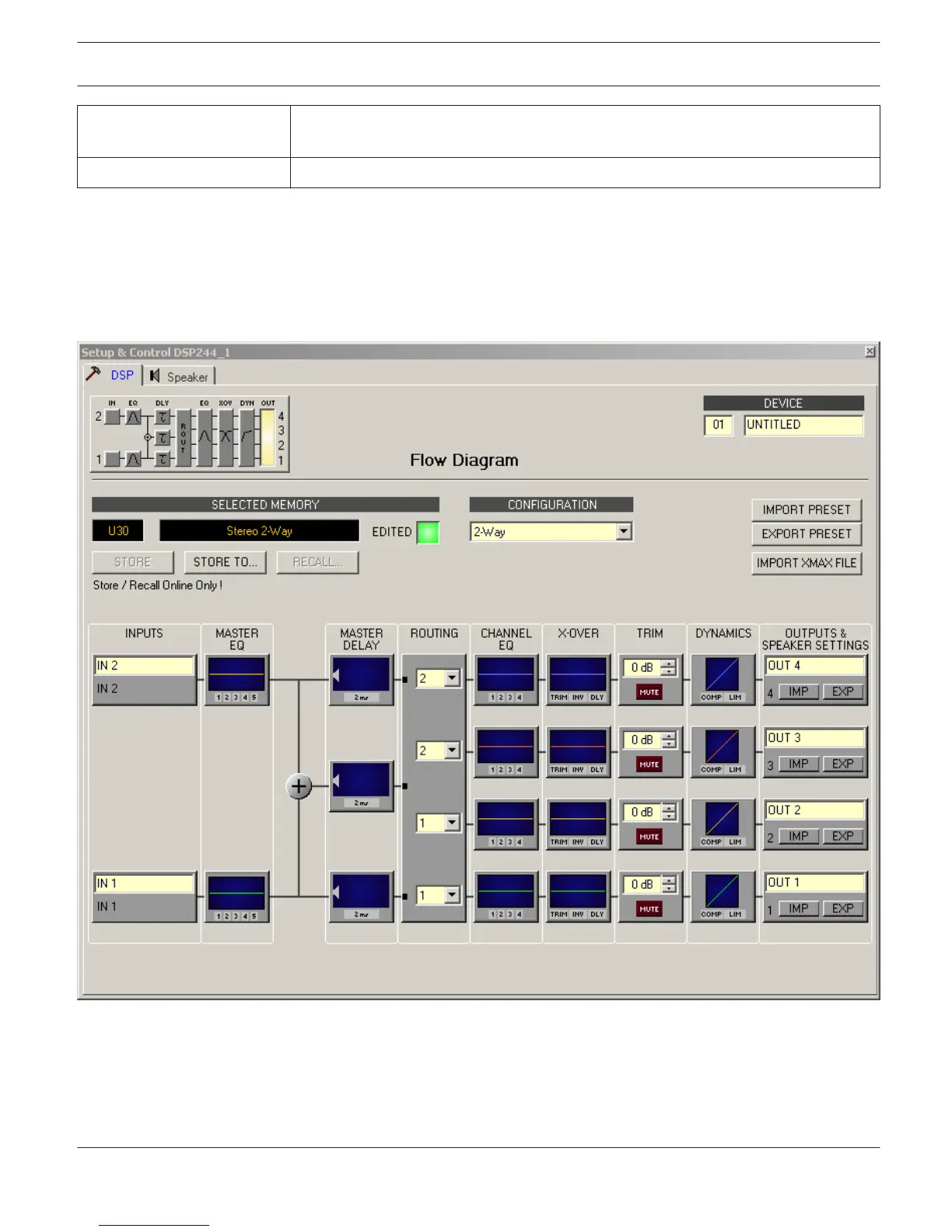 The FLOW DIAGRAM window shows a signal flow diagram, which offers a quick overview of all DSP setting of the