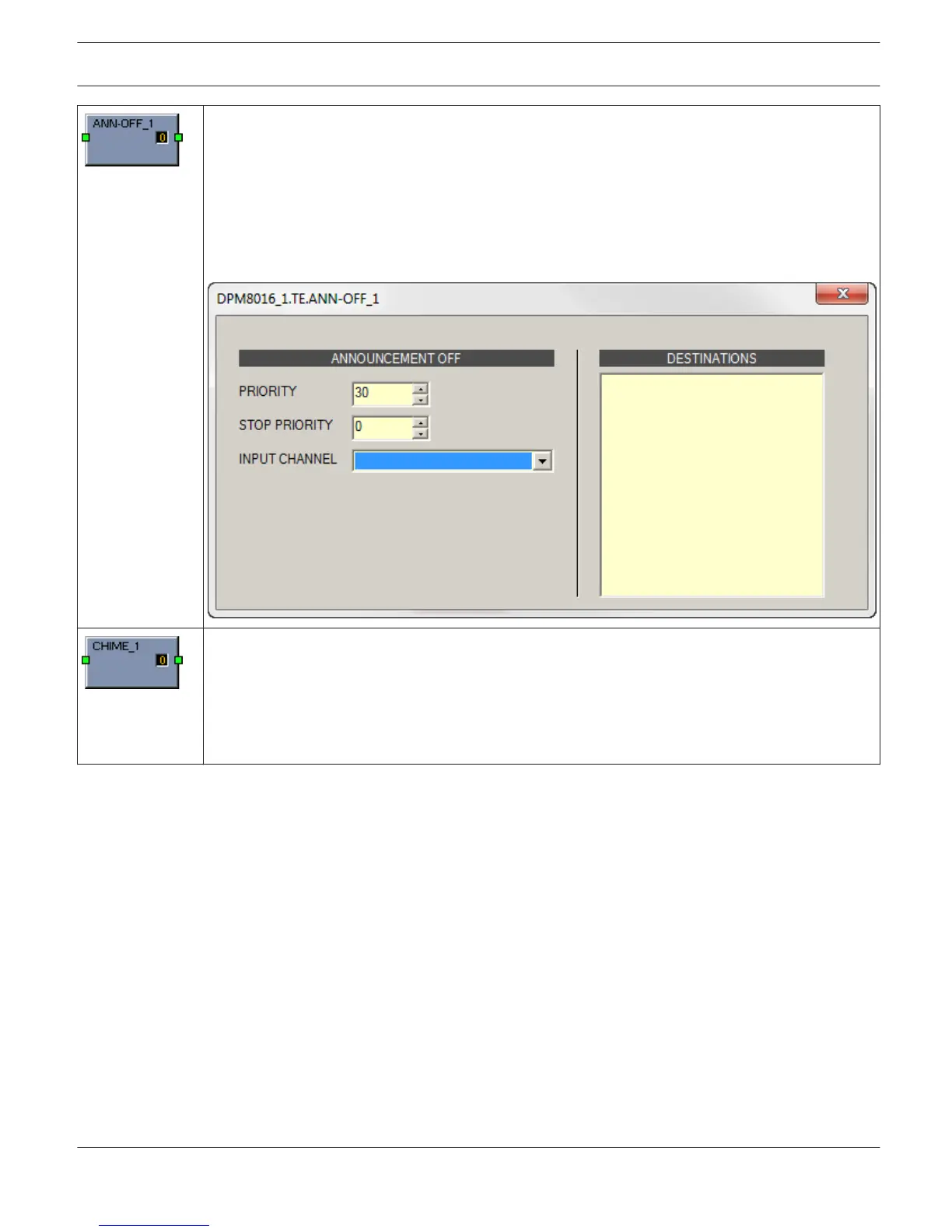 The Announcement OFF block is used to stop an announcement. Double click the block to edit the