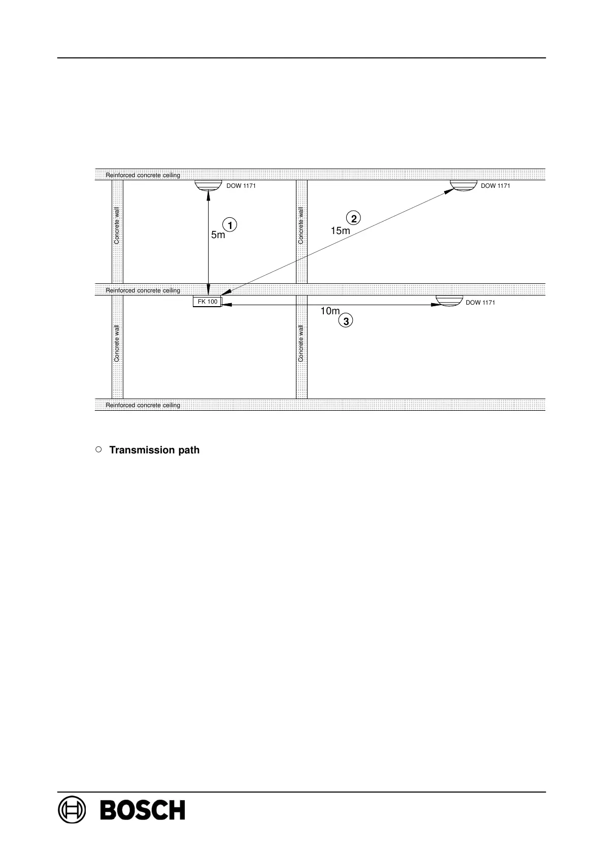 d Transmission path 1: 5m distance + reinforced concrete ceiling = 40dB + 30dB = 70dB