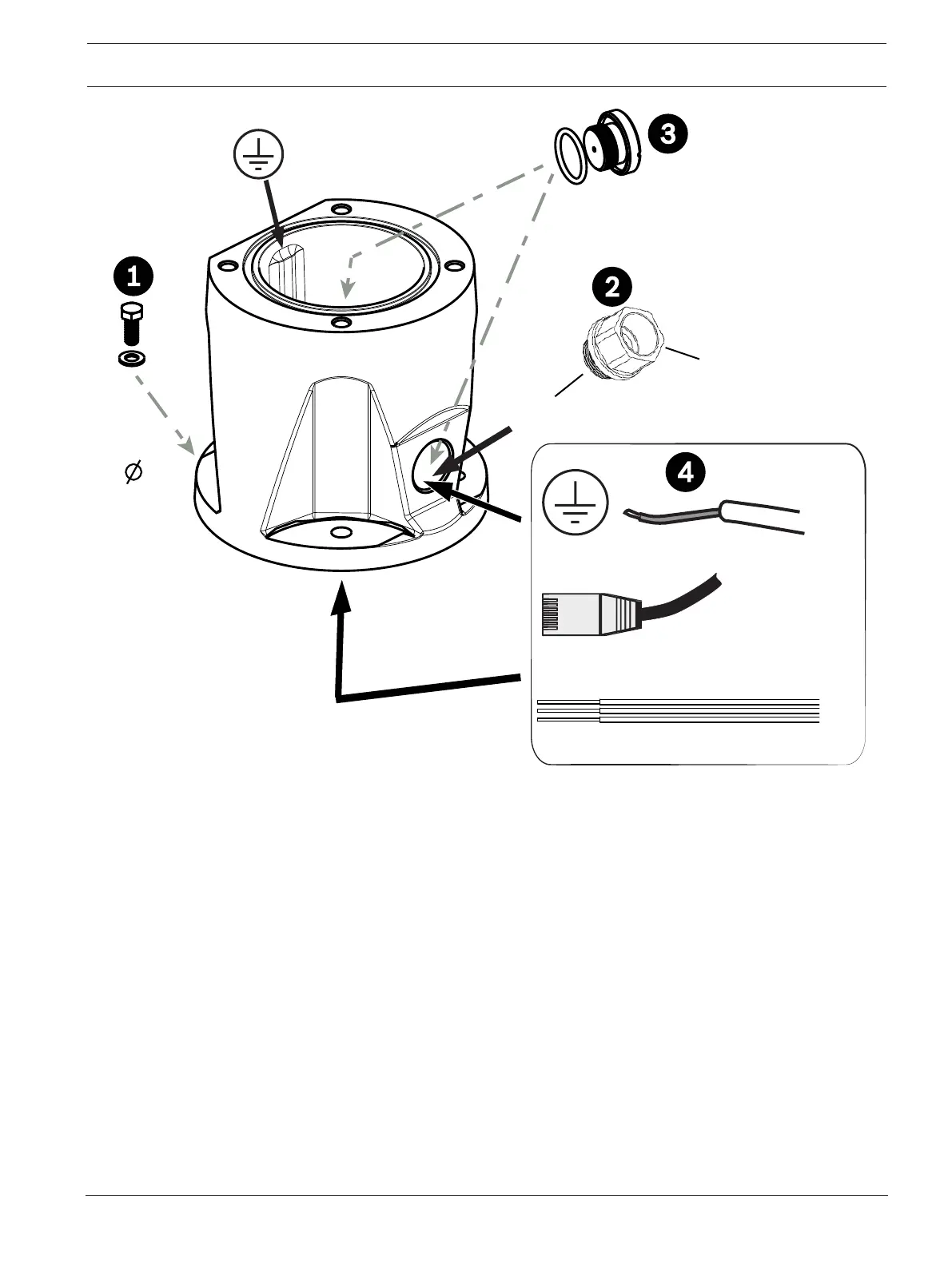 2. Attach user-supplied conduit or glands to the side hole or to the bottom hole. If applicable,