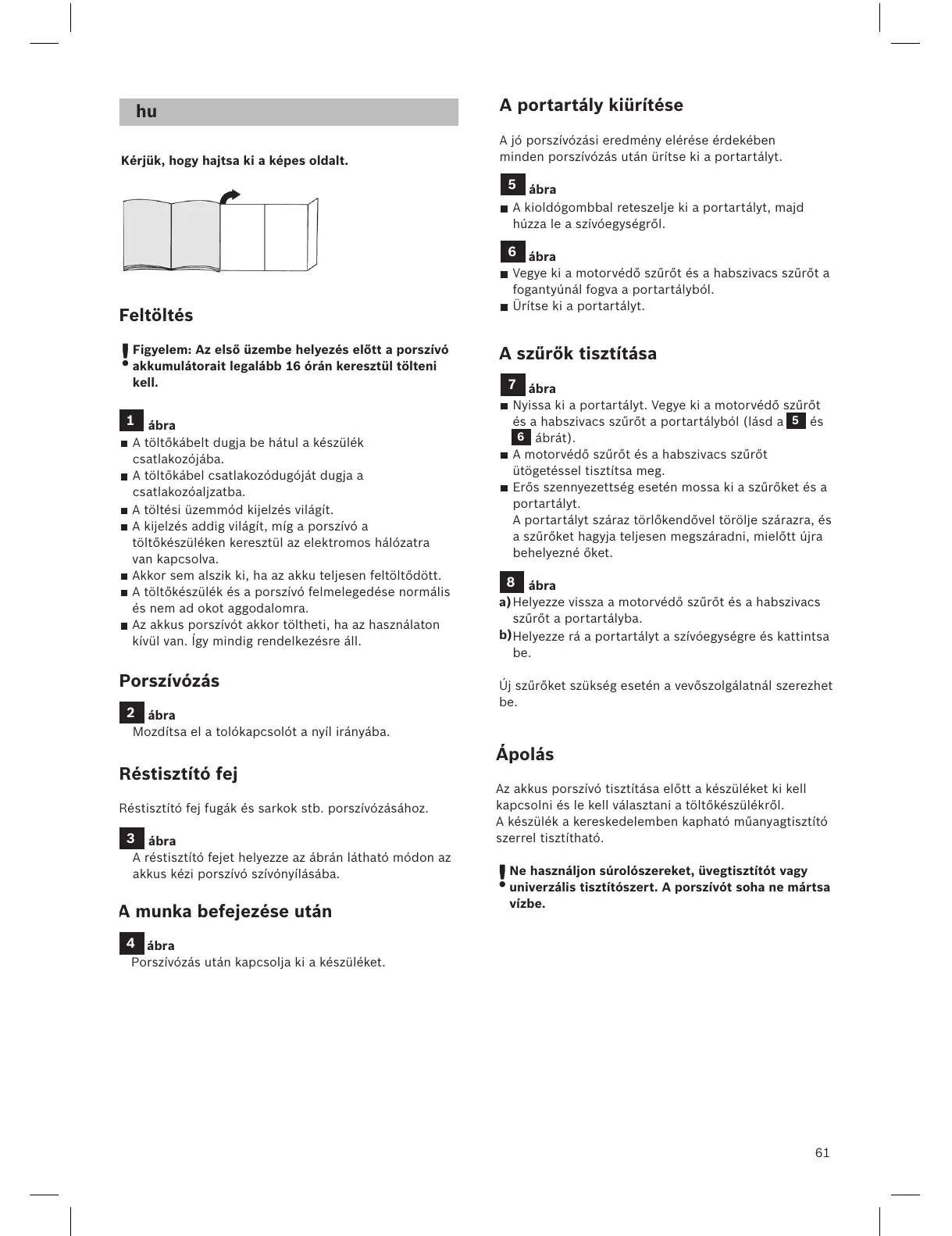 Figyelem: Az első üzembe helyezés előtt a porszívó
