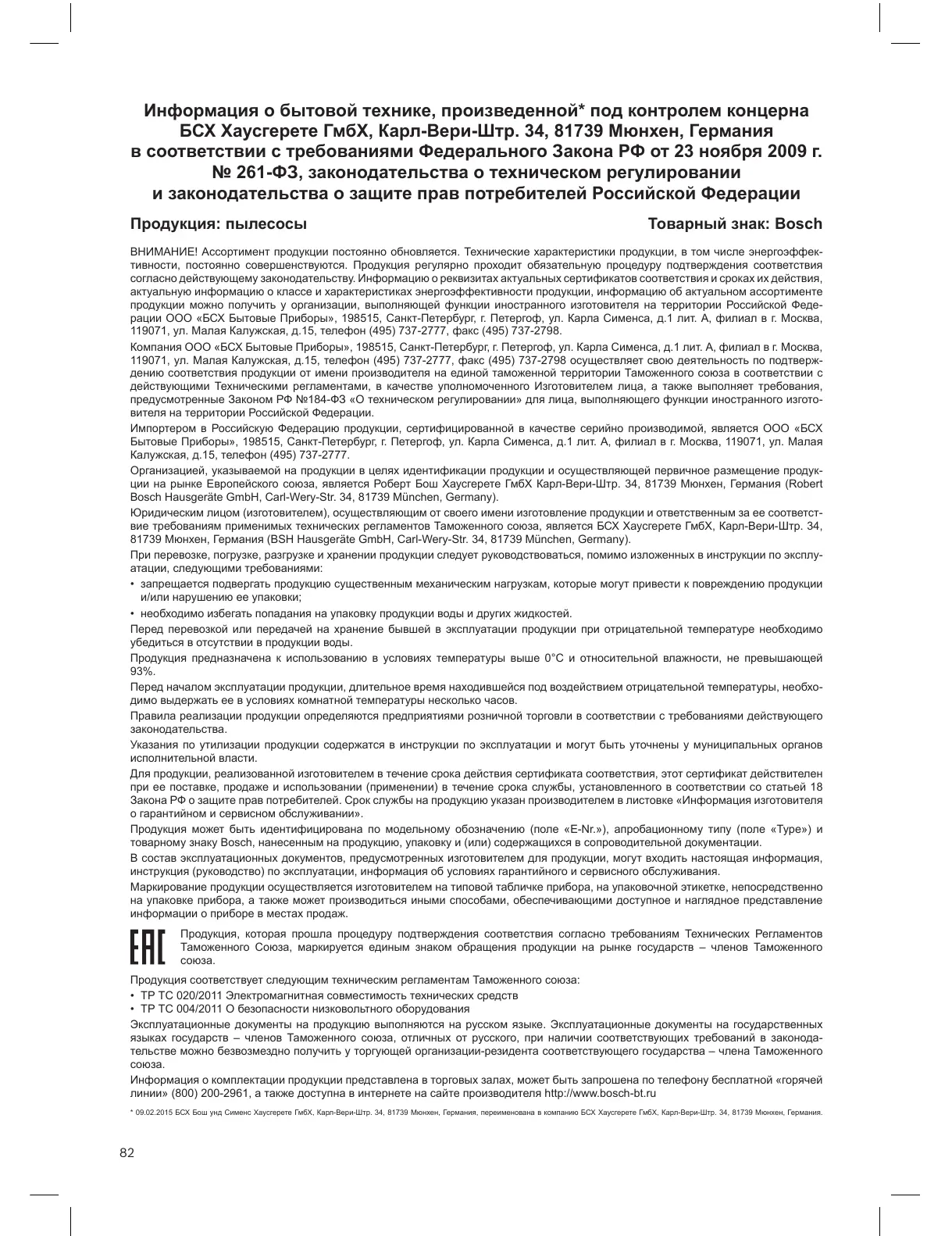 ции на рынке Европейского союза, является Роберт Бош Хаусгерете ГмбХ Карл-Вери-Штр. 34, 81739 Мюнхен, Германия (Robert