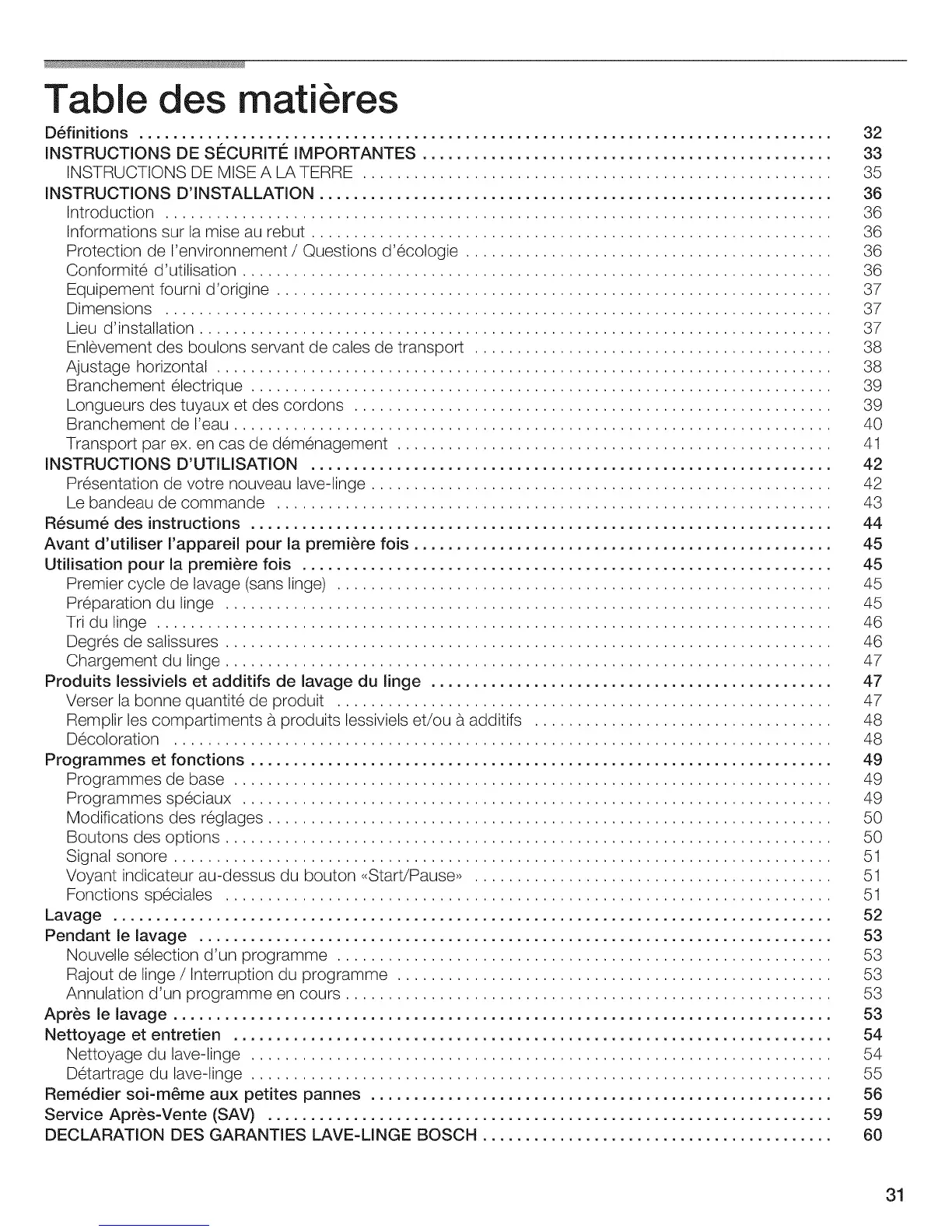 DECLARATION DES GARANTIES LAVE-LINGE BOSCH .........................................