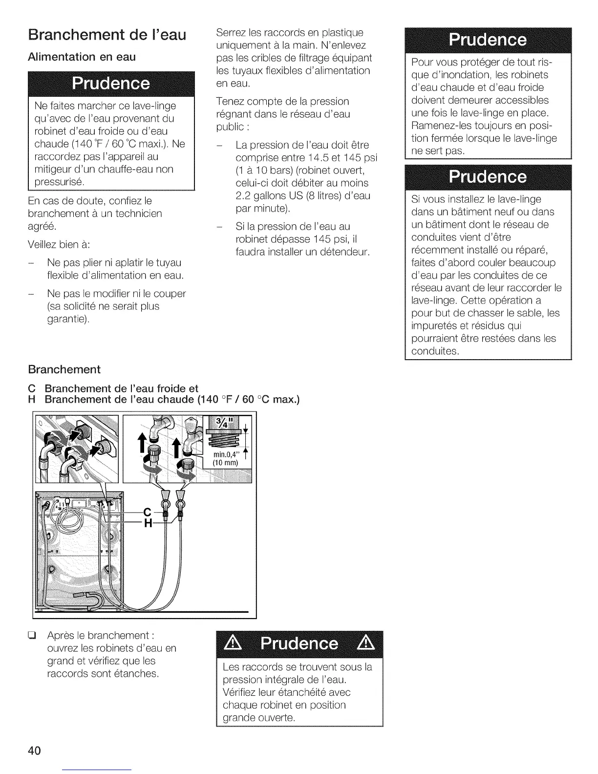 H Branchement de I'eau chaude (140 °F / 60 °C max.)