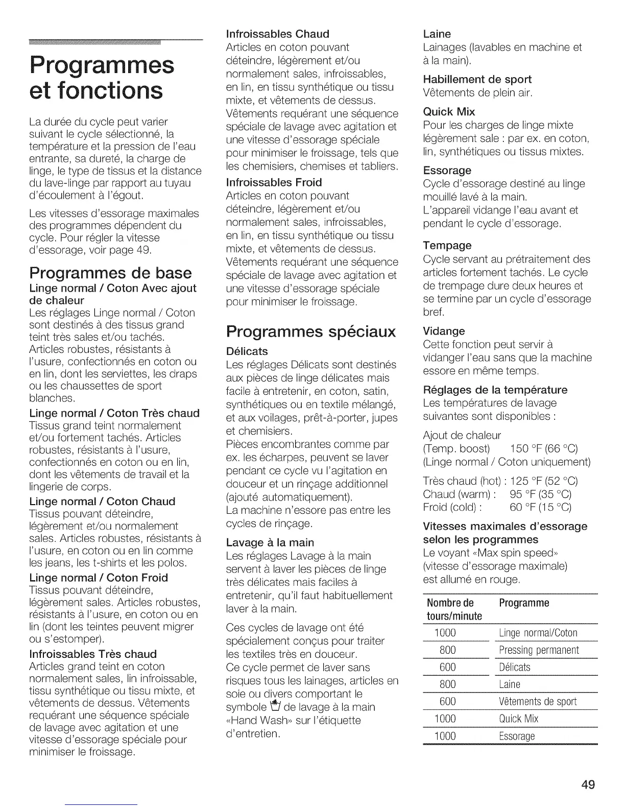 vitesse d'essorage speciale pour