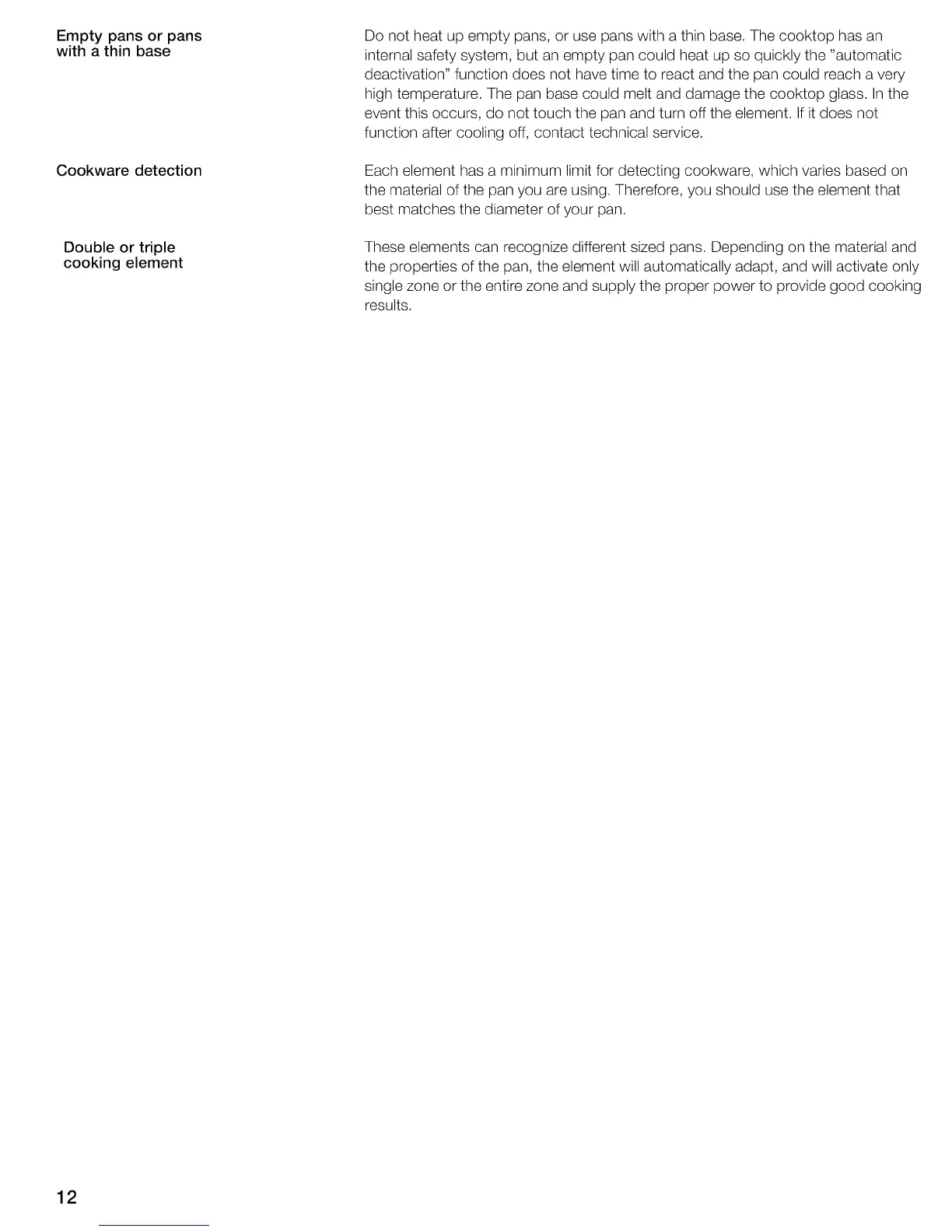 Do not heat up empty pans, or use pans with a thin base. The cooktop has an