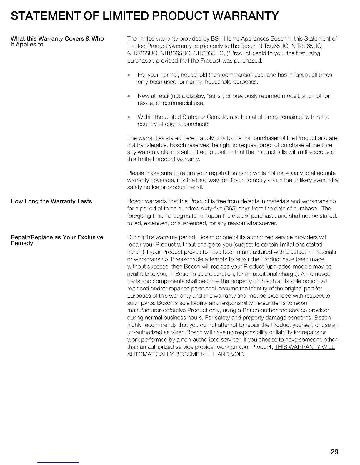 The limited warranty provided by BSH Home Appliances Bosch in this Statement of