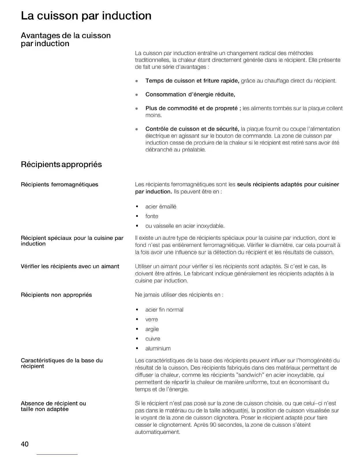 Les recipients ferromagnetiques sont les seuls recipients adaptes pour cuisiner