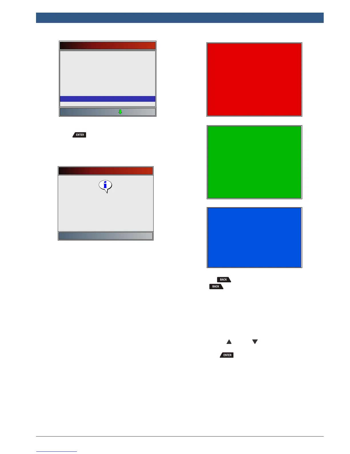 • Solid red, green, and blue screens are displayed.