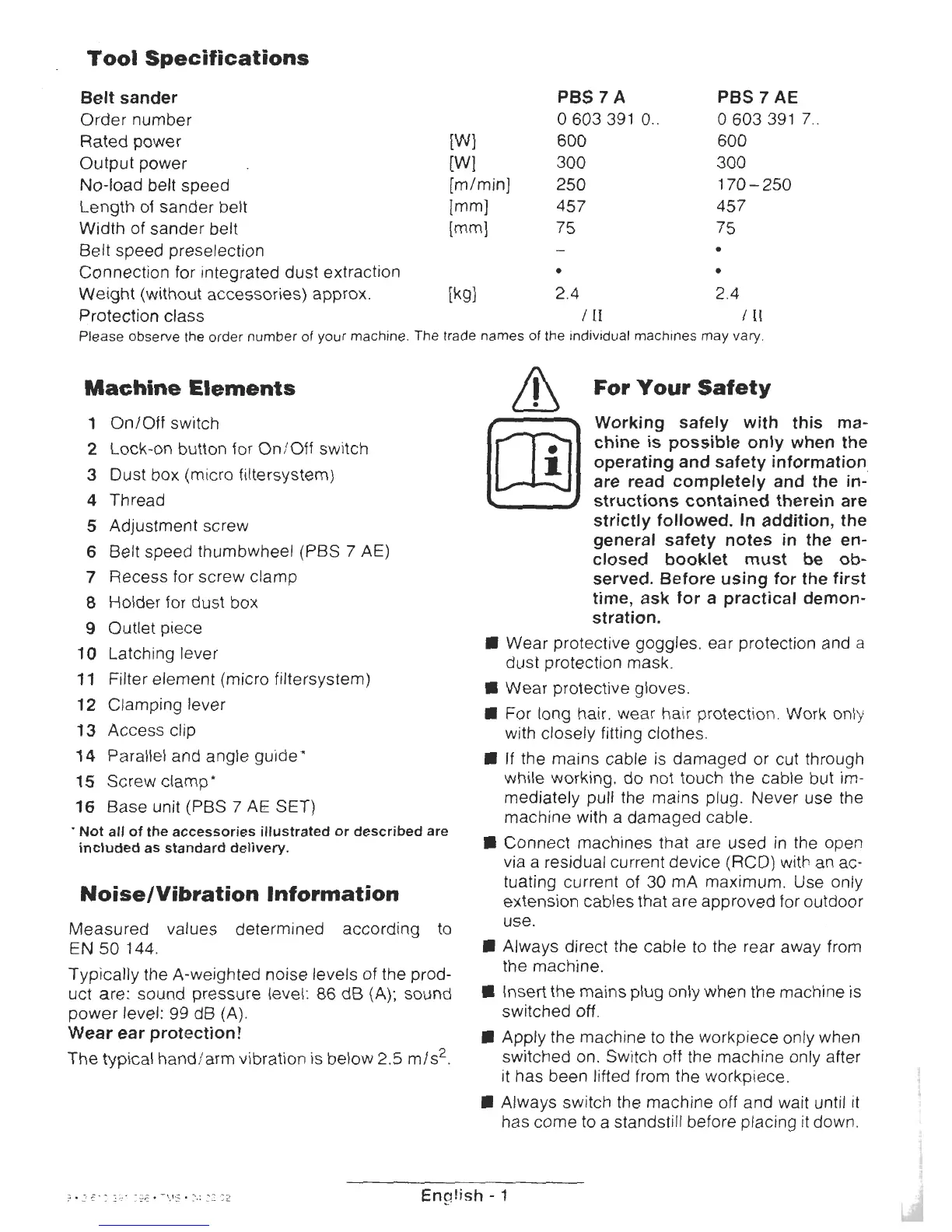 Bosch PBS 7A - Tool Specifications; Machine Elements; For Your Safety; Personal Protective Equipment
