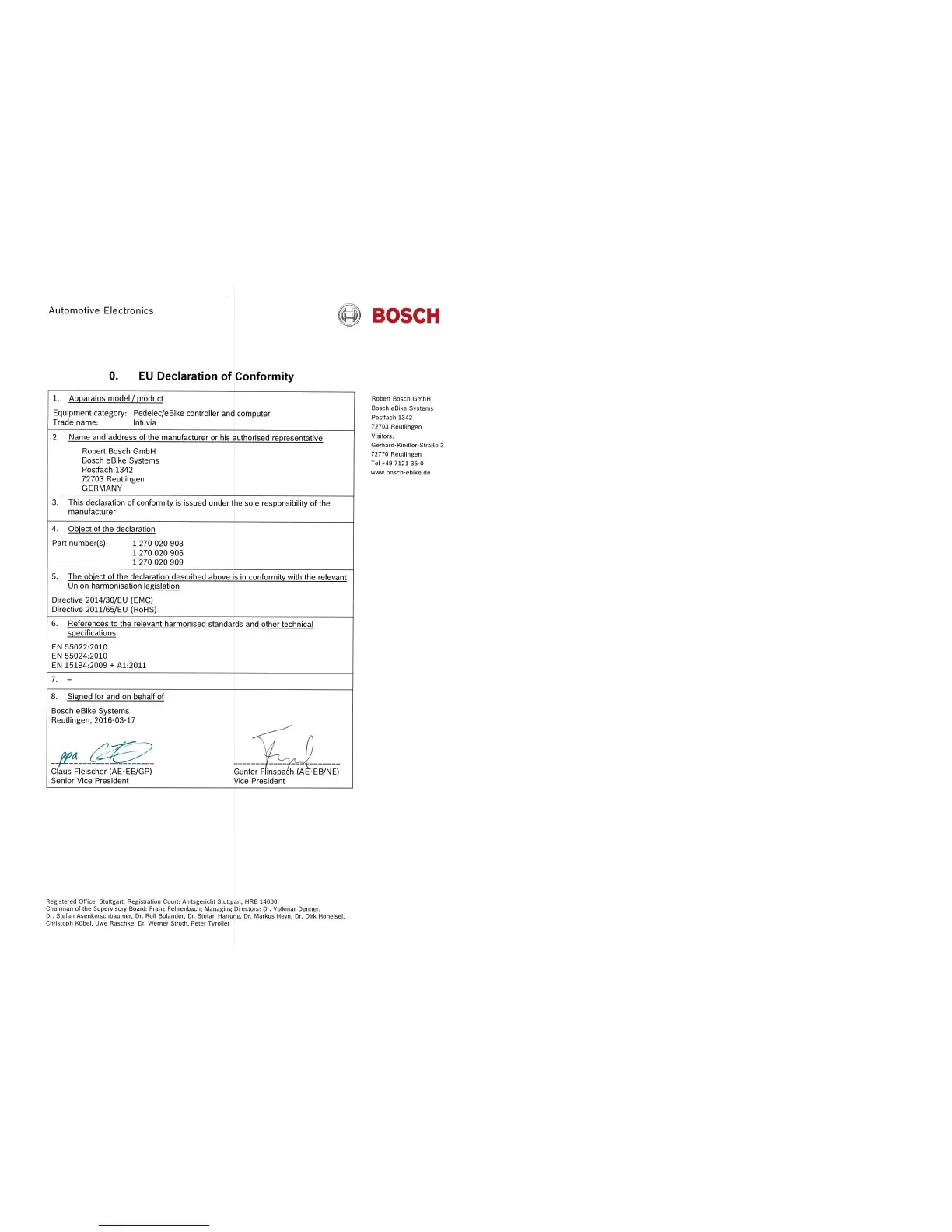 Bosch Performance Line CX - Bosch Intuvia Controller and Computer EU Declaration of Conformity
