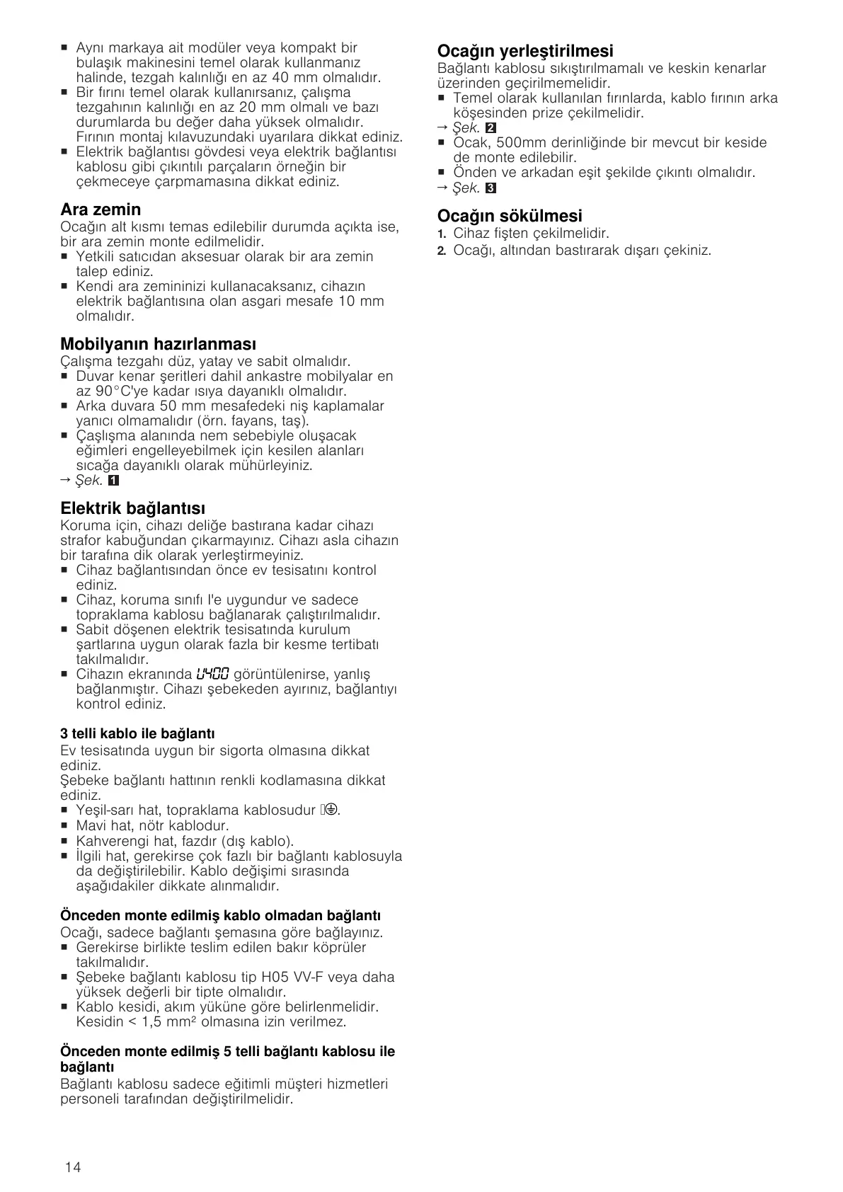 Ocağı, sadece bağlantı şemasına göre bağlayınız.