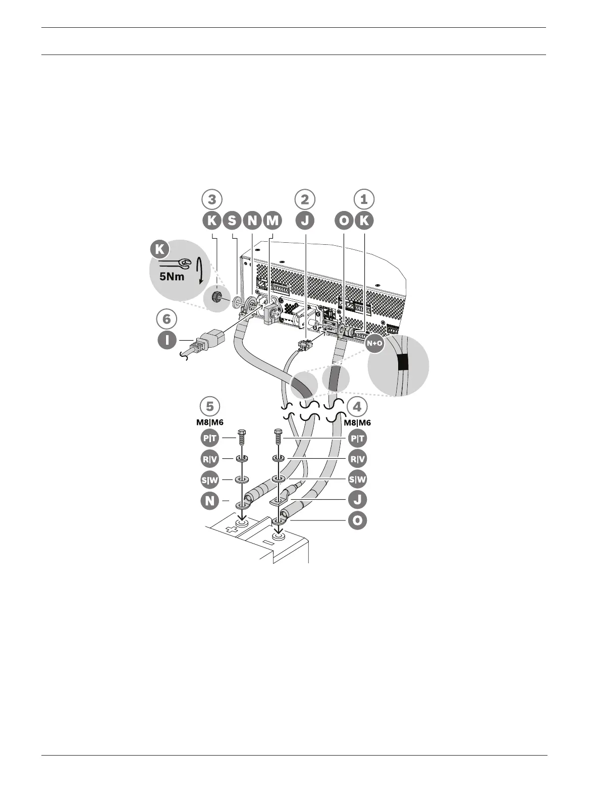 terminal of the power supply, using an M8 self‑locking nut (K). Tighten with torque 5Nm.
