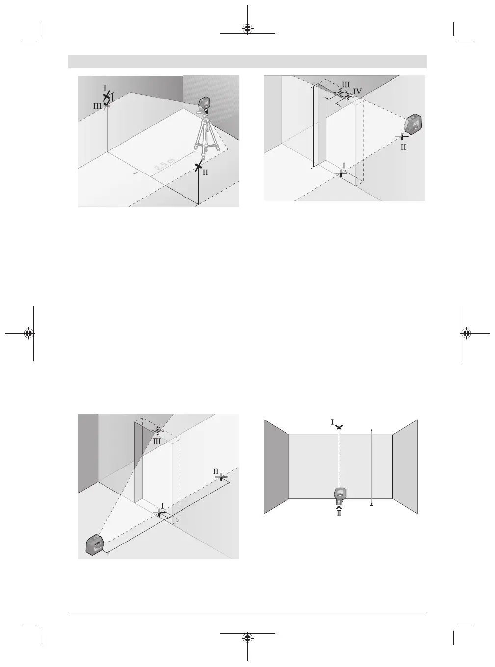 레벨링한 후 수직 레이저 라인의 중심이 지점 Ⅰ 및