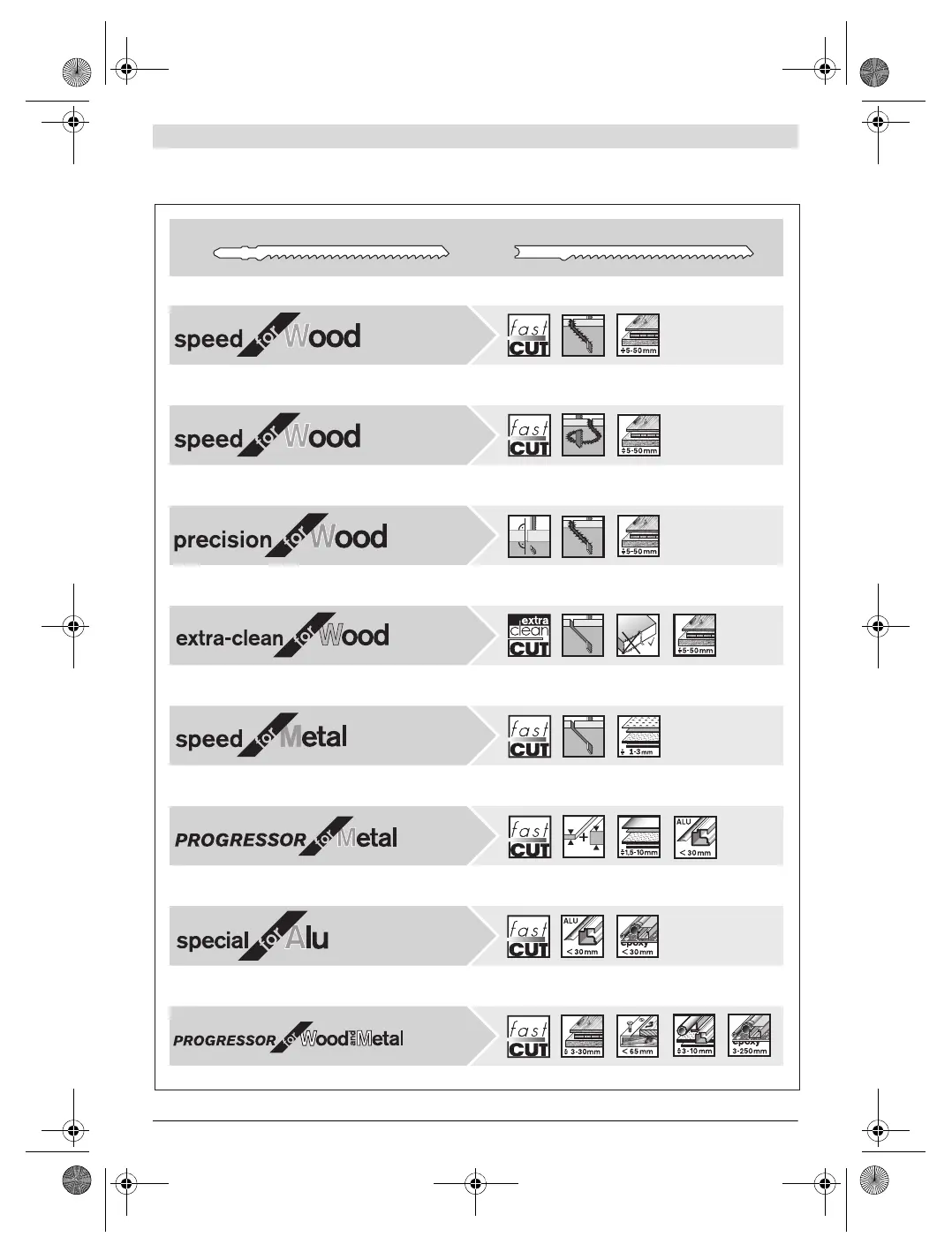 Bosch PST 65 - Saw Blade Selection; Wood Cutting Blades; Metal Cutting Blades; Aluminium Cutting Blades