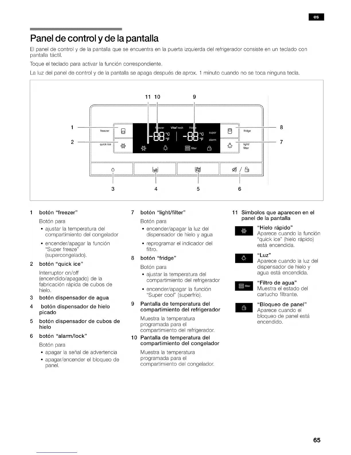 El panel de control y de la pantalla que se encuentra en la puerta izquierda del refrigerador consiste en un teclado con