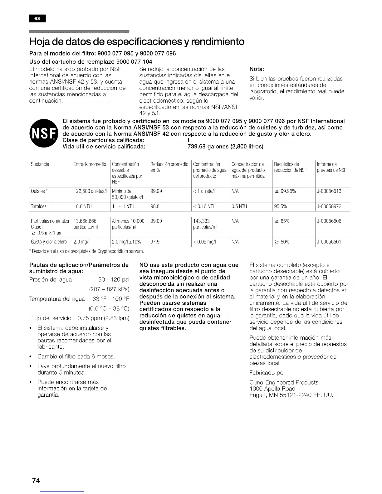de acuerdo con la Norma ANSI/NSF 53 con respecto a la reduccion de quistes y de turbidez, asi como