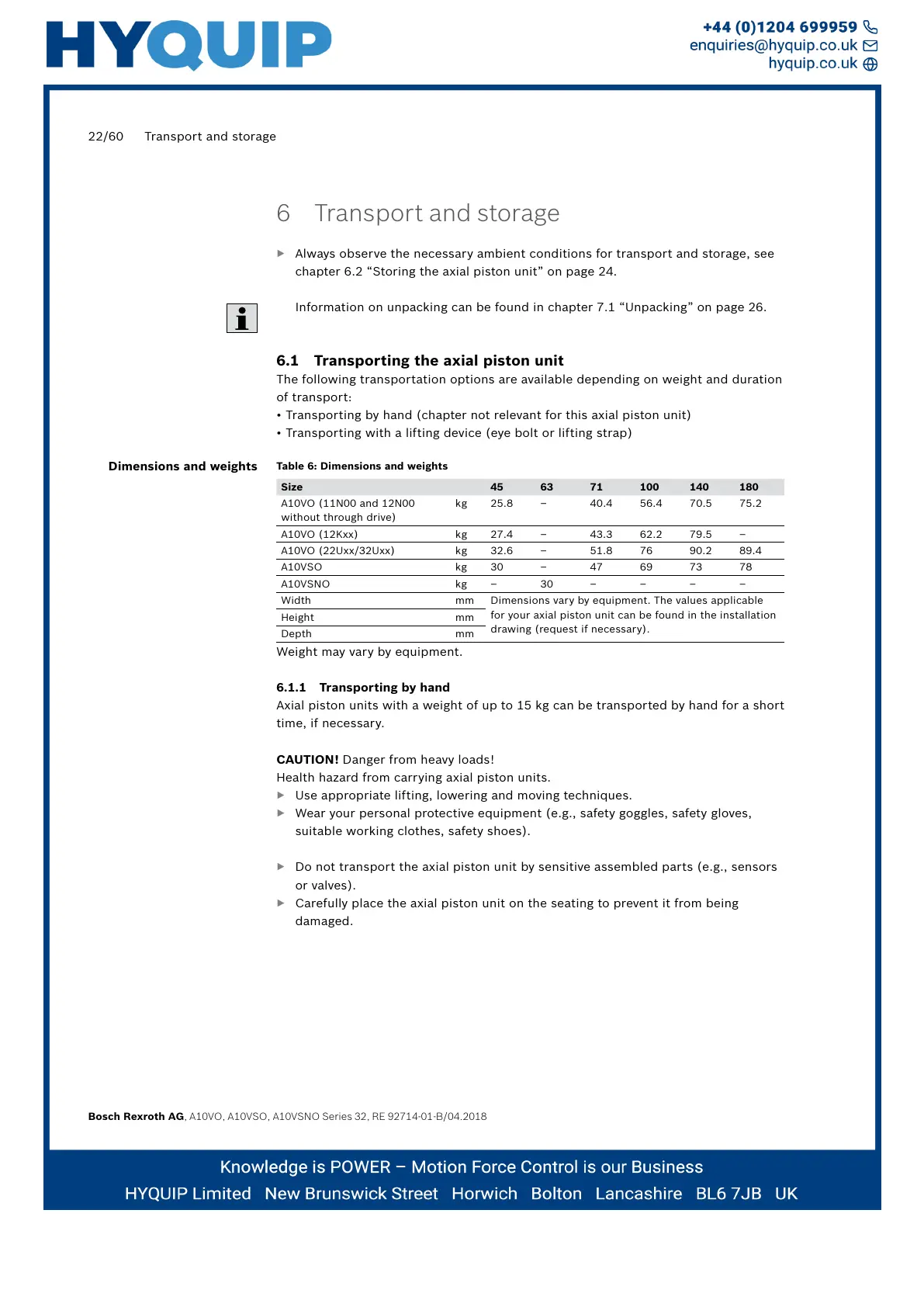 • Transporting by hand (chapter not relevant for this axial piston unit)