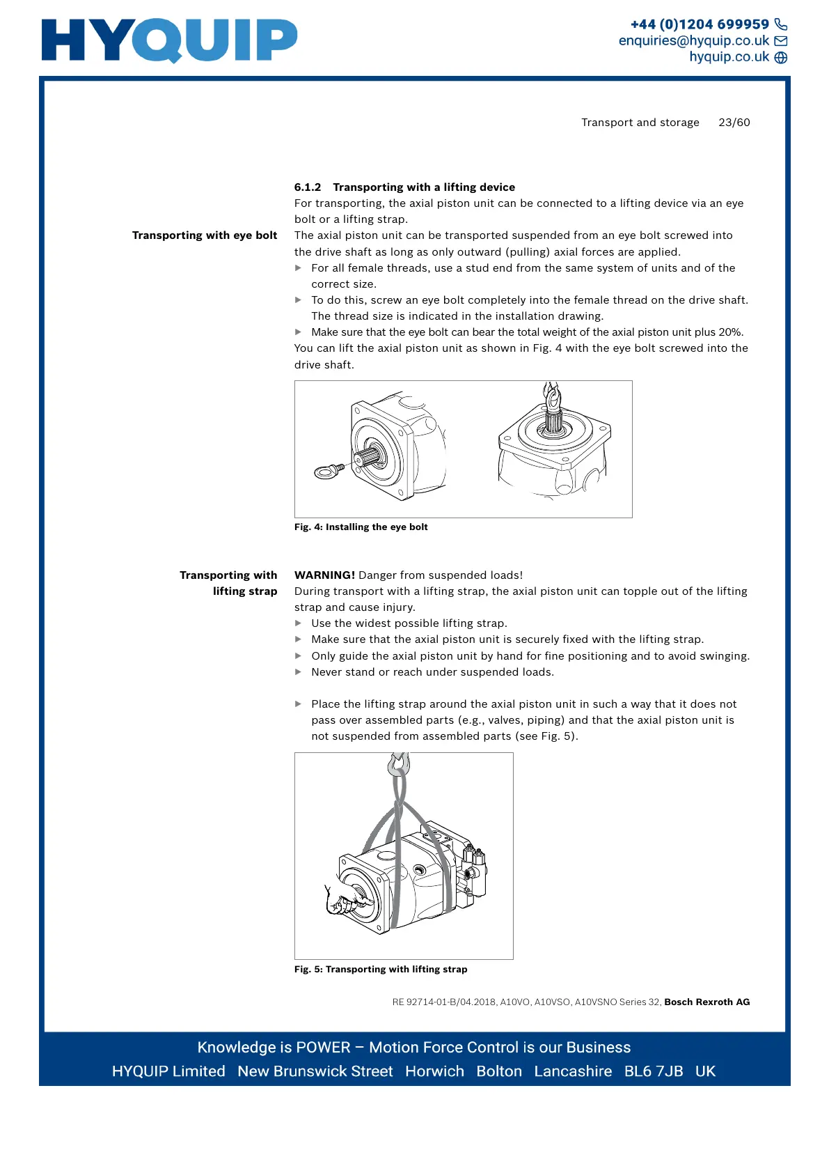 You can lift the axial piston unit as shown in Fig. 4 with the eye bolt screwed into the