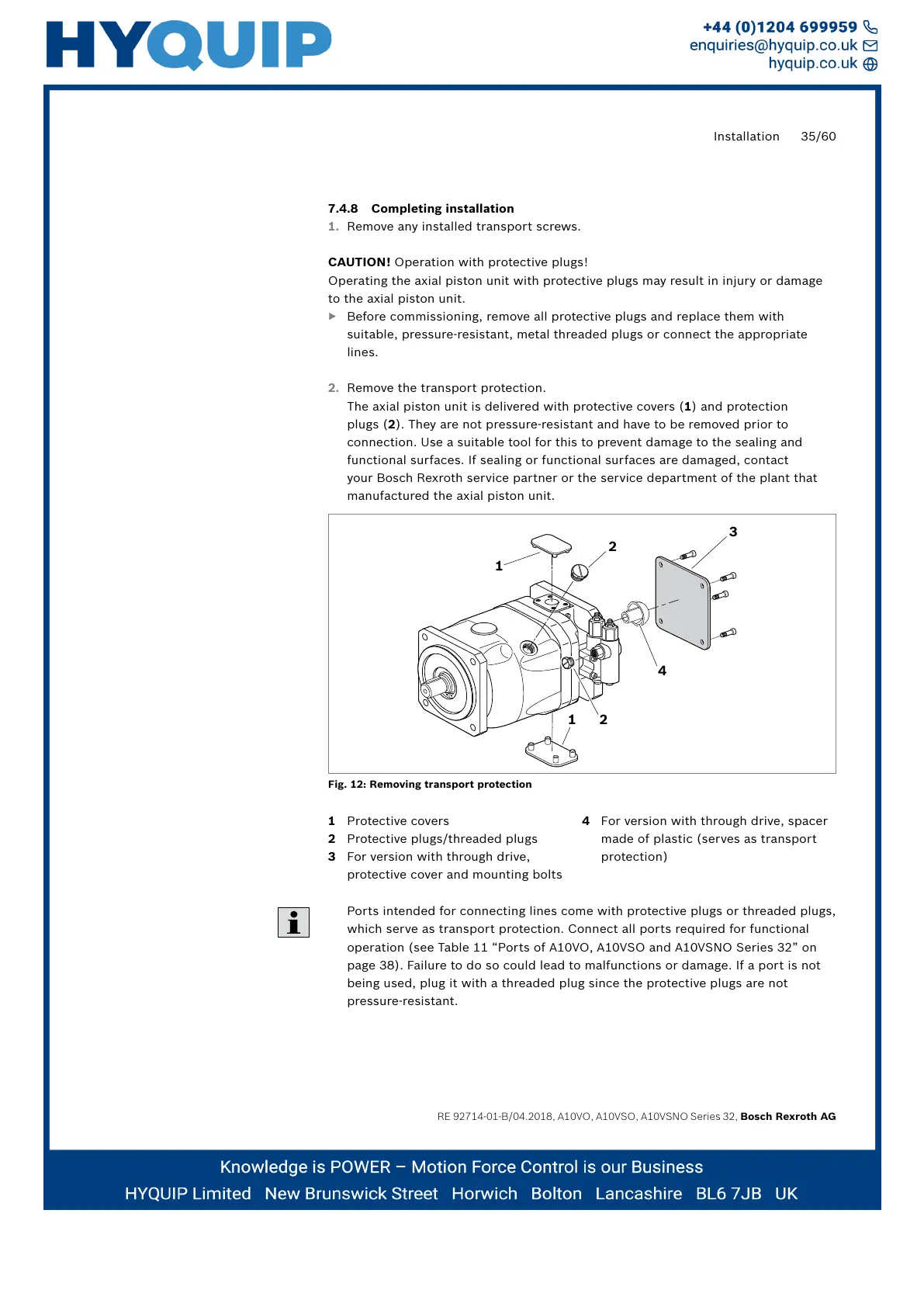The axial piston unit is delivered with protective covers(1) and protection