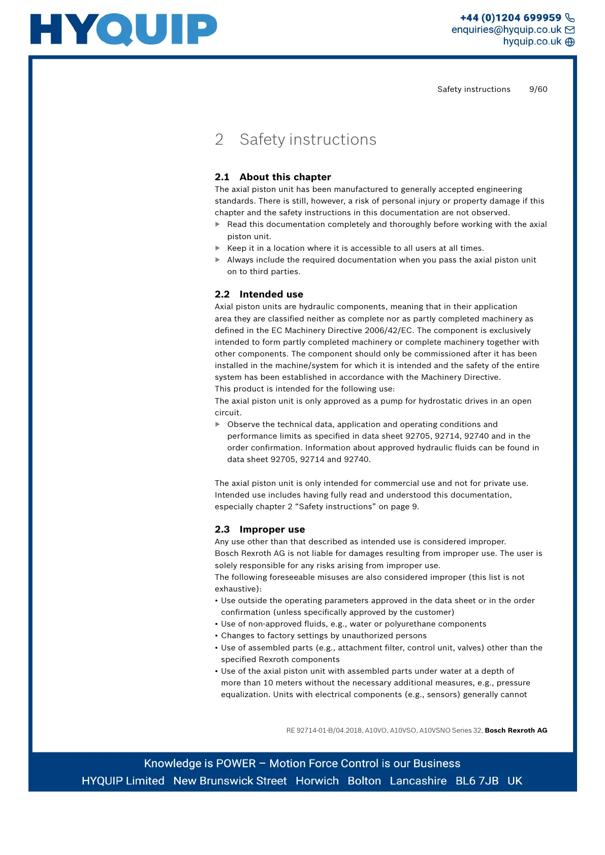 The axial piston unit is only intended for commercial use and not for private use.