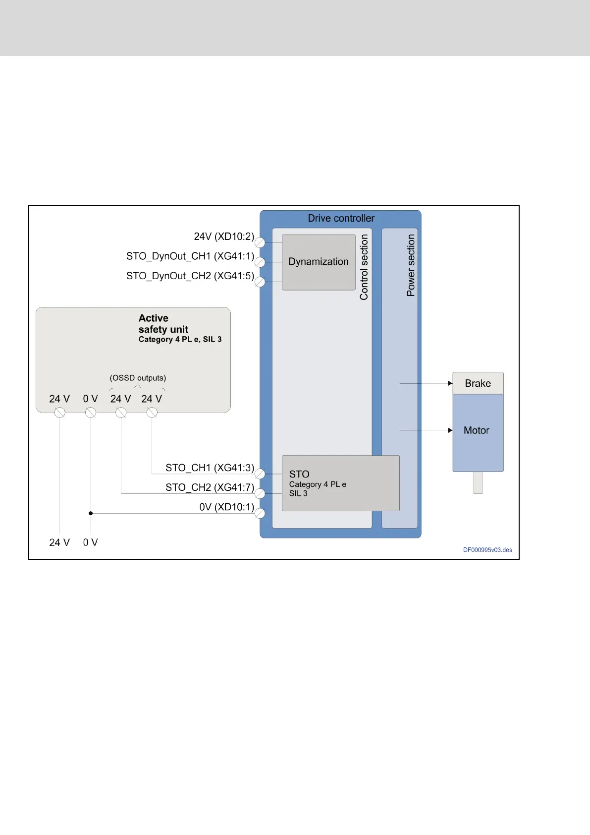 Fig. 7-4: STO function with active safety unit (plus-plus-switching outputs)