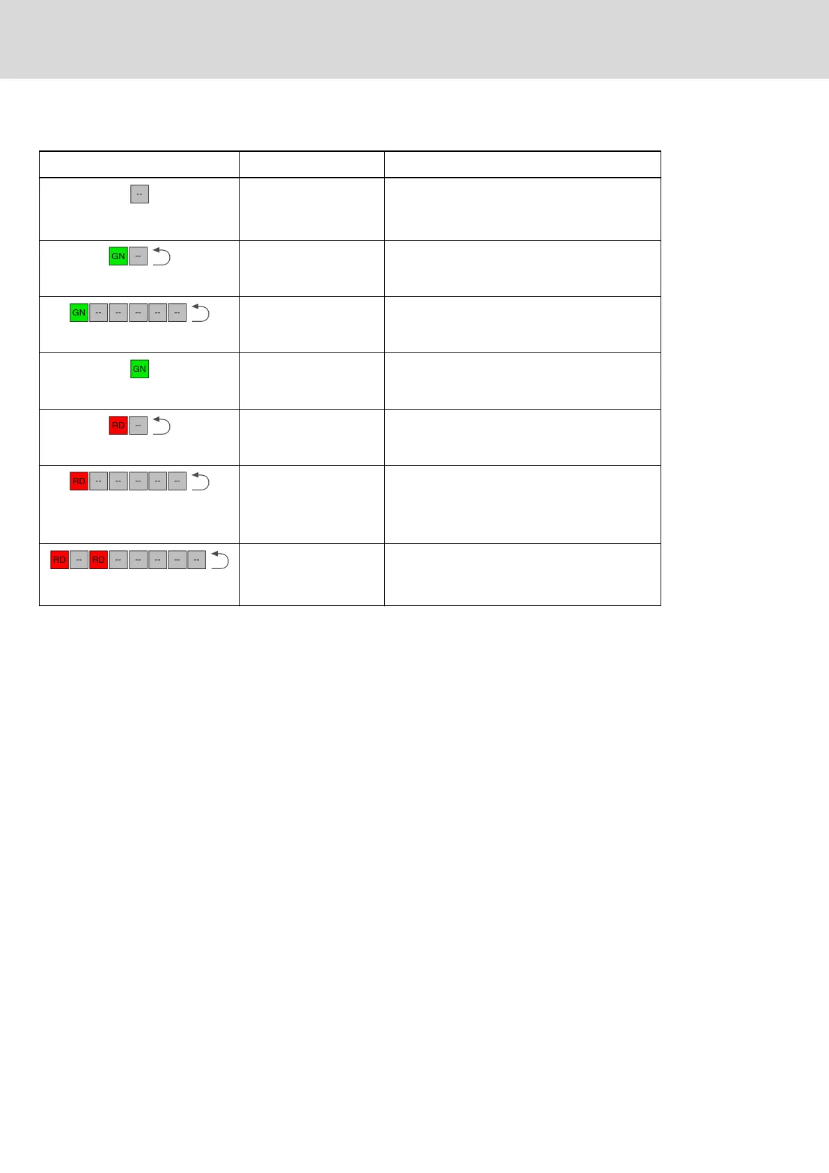 the squares: GN = LED permanently lit green, RD = LED per‐