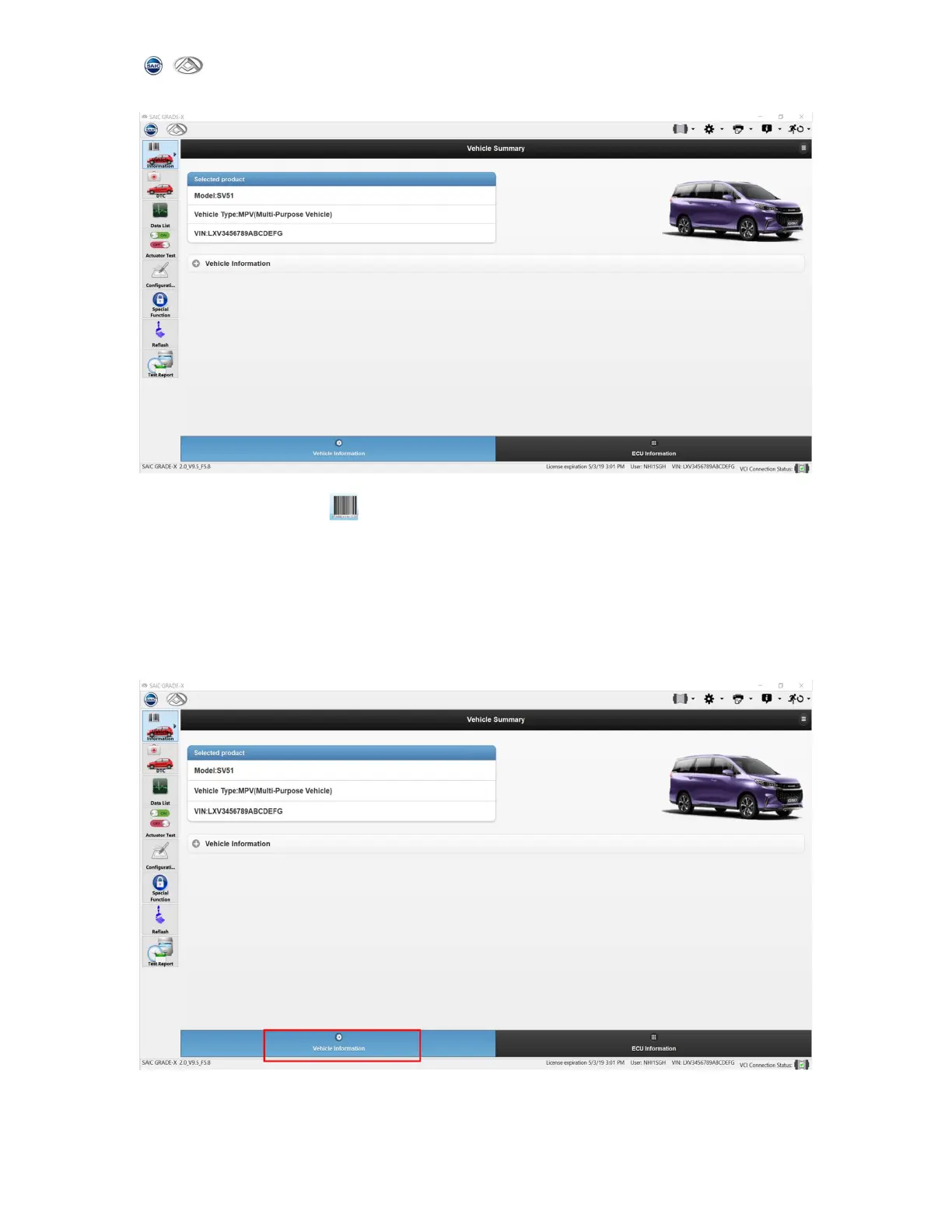 tabs: vehicle Information and ECU Information,as shown below:
