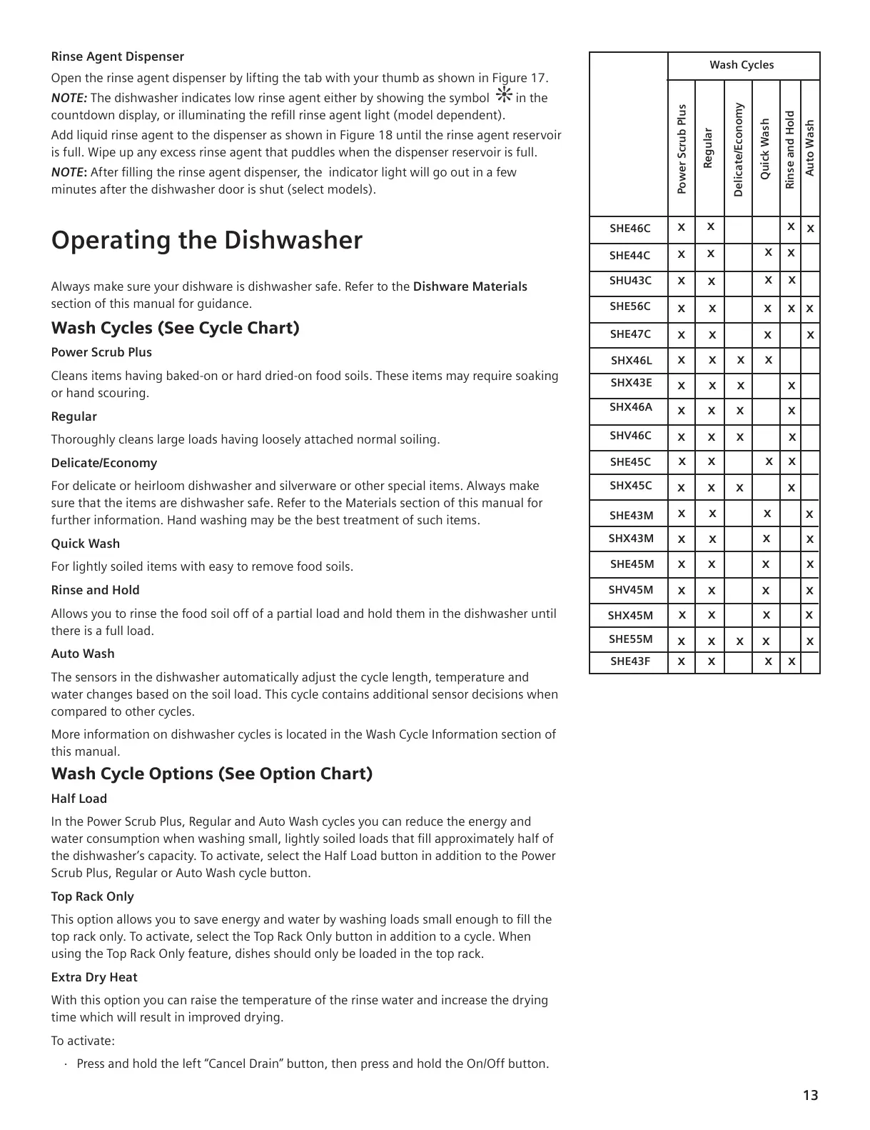Wash Cycle Options (See Option Chart)