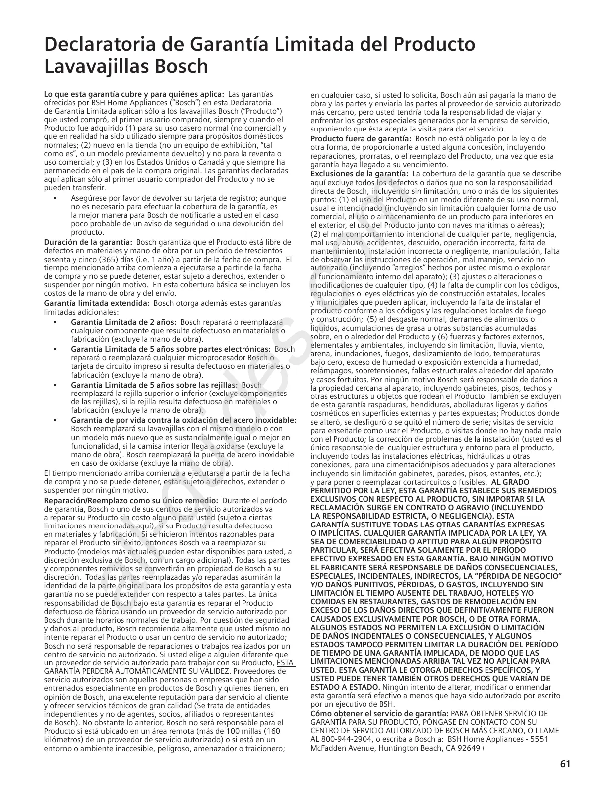 Bosch SGE44C - Declaración de las Garantías