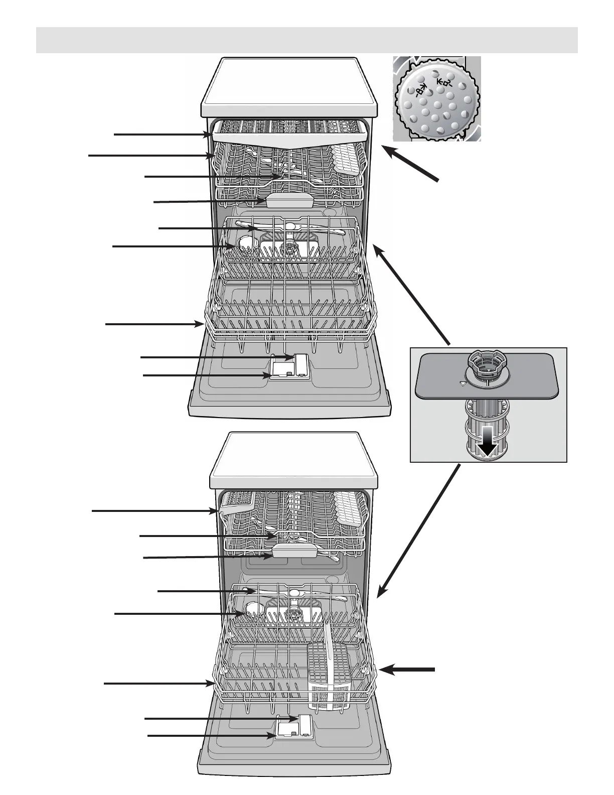 Bosch SGE63E06UC - Dishwasher Components Identification; Racks and Cutlery Basket; Spray Arms and Filter System; Dispensers and Salt Container