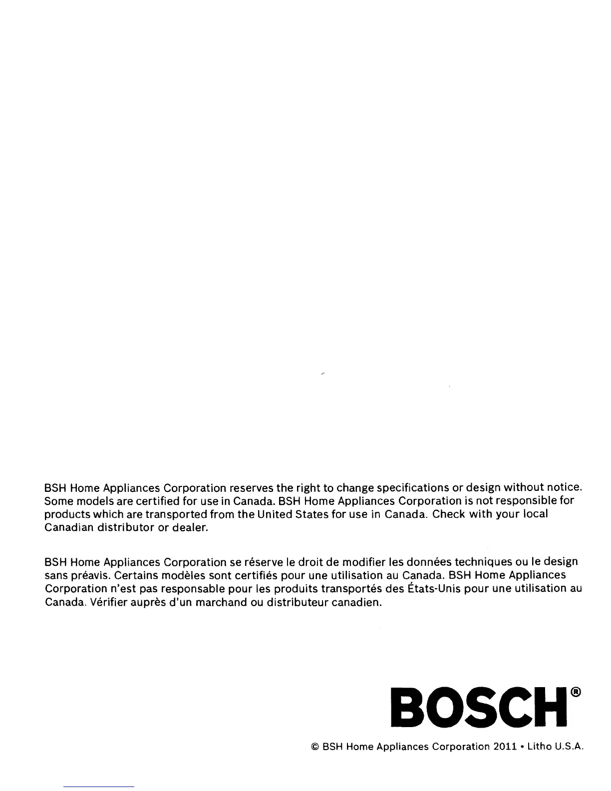 Some models are certified for use in Canada. BSH Home Appliances Corporation is not responsible for