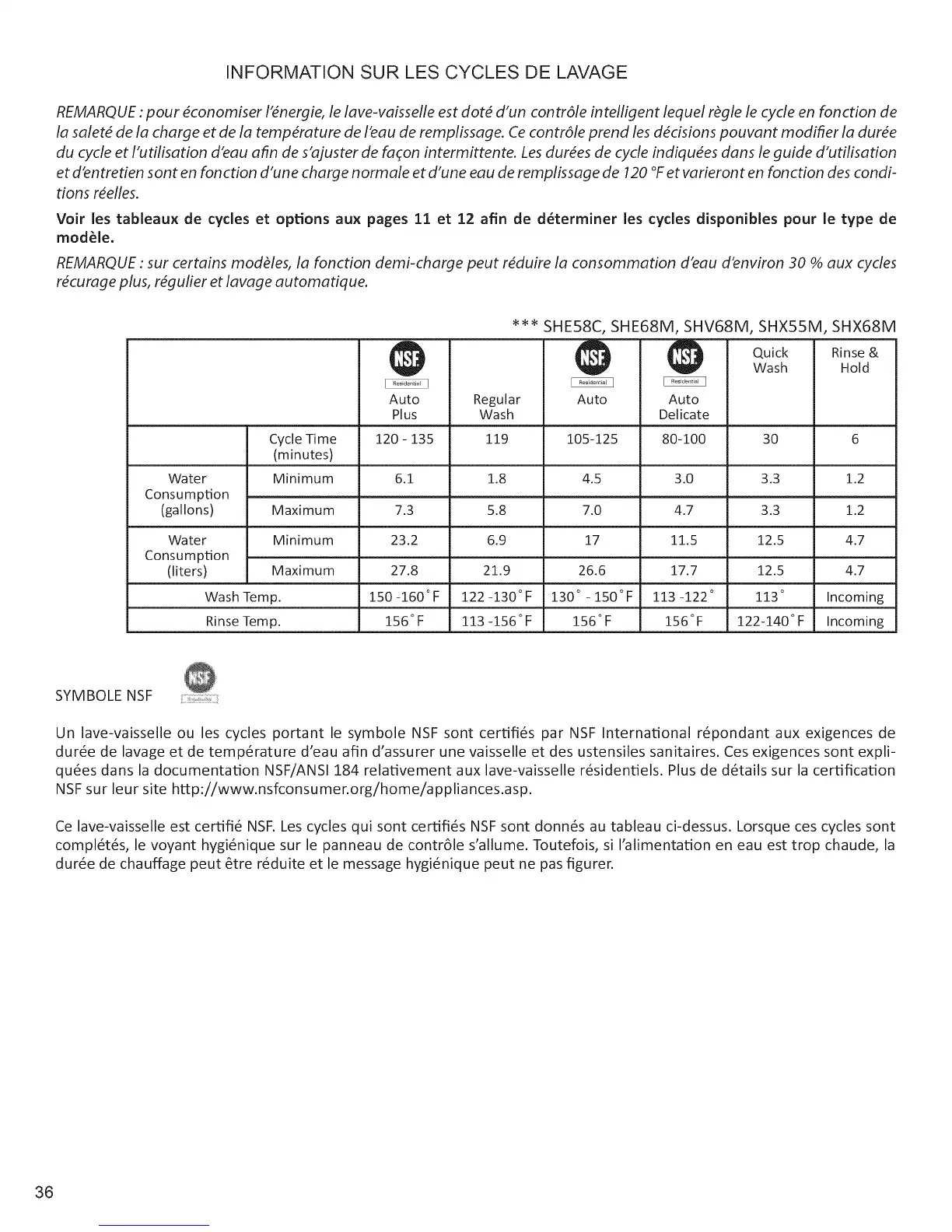 Ce lave-vaisselle est certifi6 NSF.Les cycles qui sont certifi6s NSFsont donn6s au tableau ci-dessus. Lorsque ces cycles sont