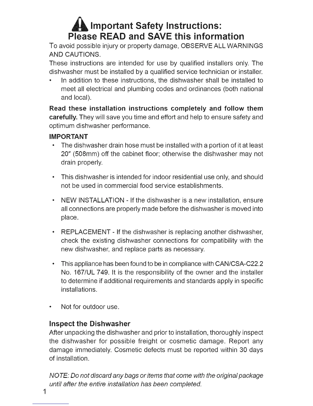 After unpacking the dishwasher and prior to installation, thoroughly inspect