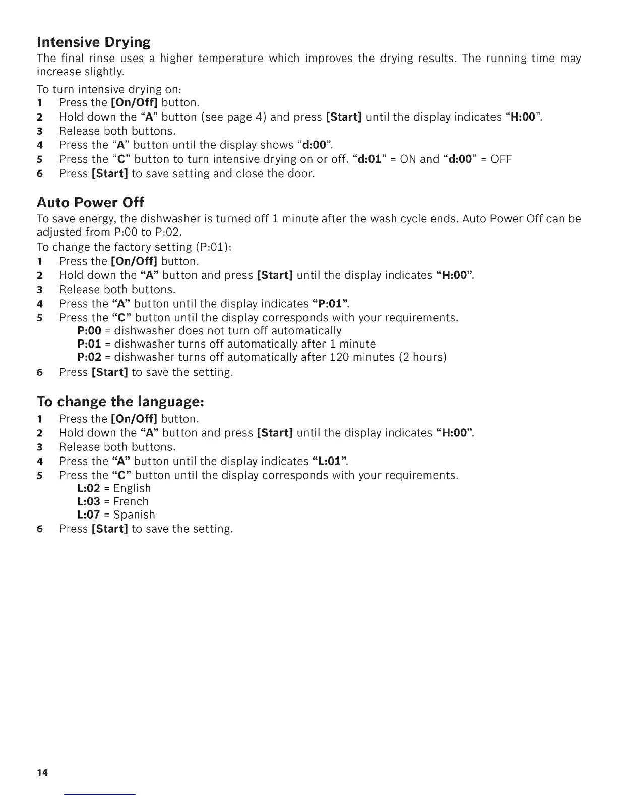 5 Press the "C" button to turn intensive drying on or off. "d:0:l." = ON and "d:00" = OFF