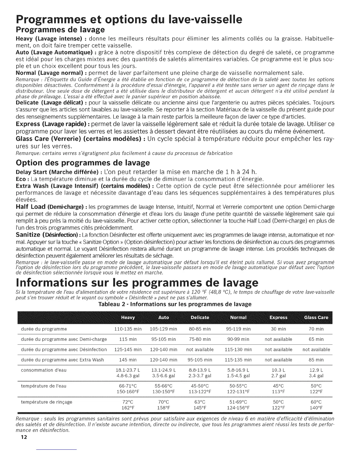 Tableau 2 - Inforrnations sur los prograrnrnes de lavage