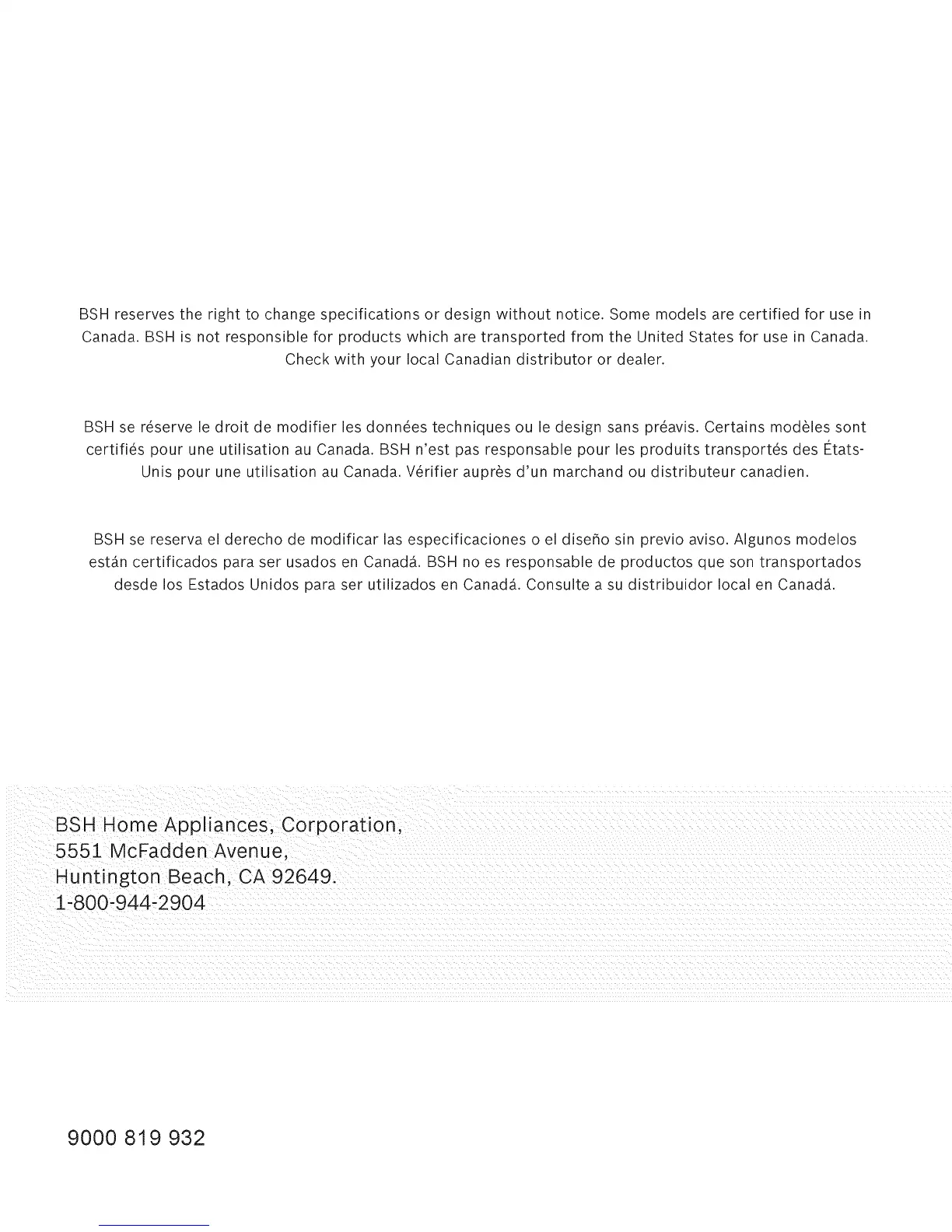 Canada. BSH is not responsible for products which are transported from the United States for use in Canada.